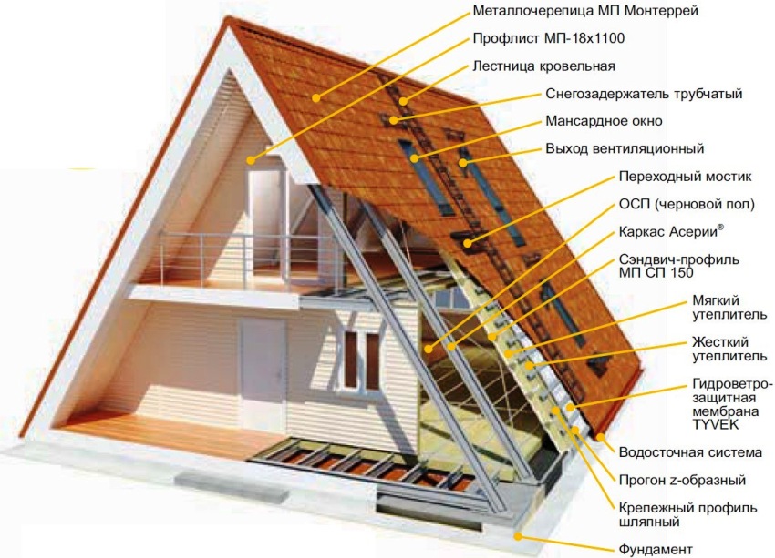 โครงสร้างของกระท่อมทำในรูปของสามเหลี่ยม บ้านหลังนี้มีสองอาคาร ไม่มีกำแพงฟังก์ชั่นของพวกเขาจะดำเนินการโดยลาดหลังคา โดยทั่วไปอาคารประกอบด้วยฐานกรอบซึ่งทำจากกรอบรูปสามเหลี่ยมหลายอัน หลังคาทรงจั่วลดระดับลงไปที่ฐานราก ในรูปถ่ายของบ้านในชนบทคุณสามารถเห็นตัวเลือกการออกแบบอื่น ๆ โดยหลังคาเริ่มต้นด้วยใต้ถุนต่ำ