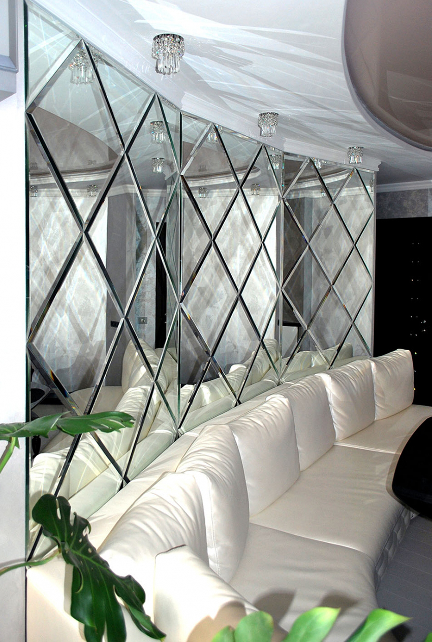 Sa tulong ng mga naka-mirror na tile na may isang facet, maaari mong buhayin ang mga naka-bold na solusyon sa disenyo, salamat sa kung saan ang silid ay makakakuha ng isang naka-istilo, sopistikadong at marangyang hitsura, at magagalak ang mga mata ng mga may-ari ng maraming taon.
