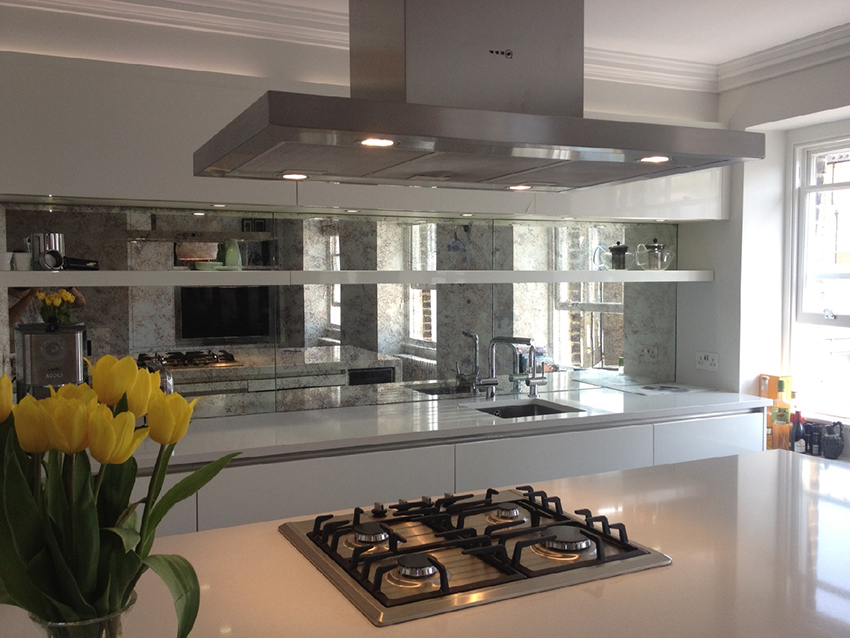 Ang kusina, sa loob nito ay pinalamutian ng mga pagsingit ng salamin sa mga dingding at kisame, ay magmukhang mahal at naka-istilo. Ginagamit ang materyal na ito upang lumikha ng mga panloob na disenyo ng interior, baroque at empire. Salamat sa paglalaro ng ilaw at silaw, na makikita sa mga salamin, nilikha ang isang mataas, solemne na kalagayan.