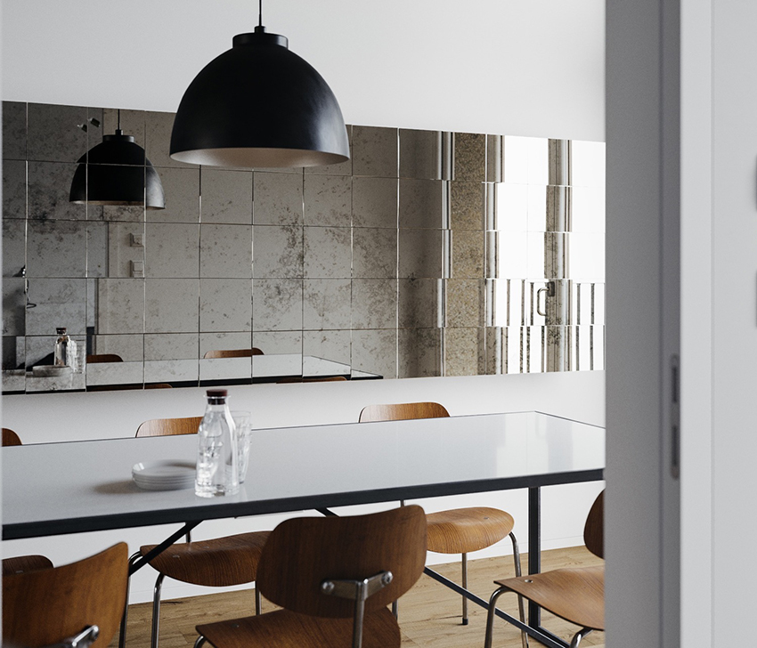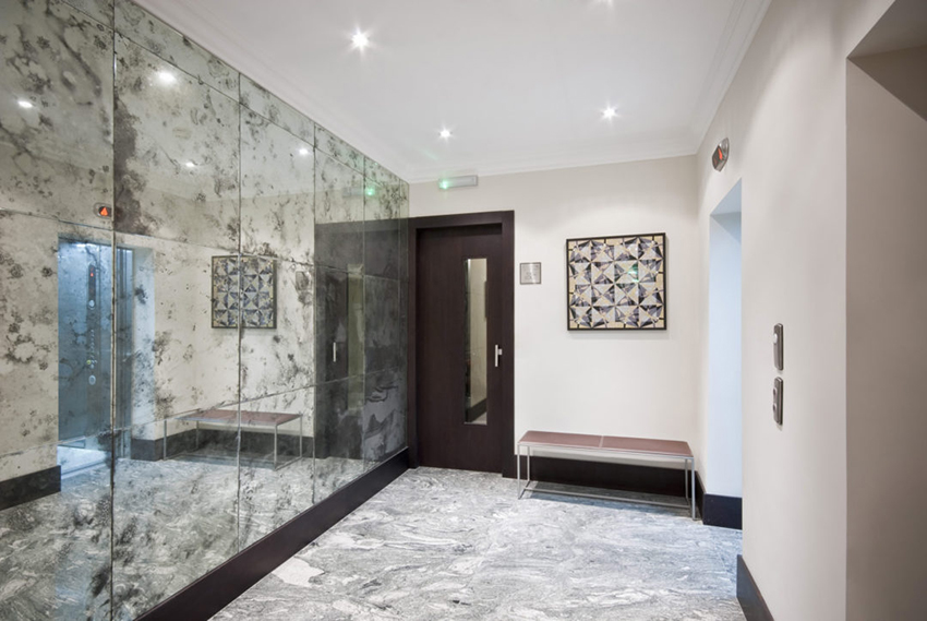 Ang isang mahusay na solusyon ay isang kumbinasyon ng mga lugar na natapos na may mga elemento ng salamin na may iba't ibang antas ng pagsasalamin, na dapat ay sa iba't ibang mga antas na may kaugnayan sa lugar ng pagmamasid.