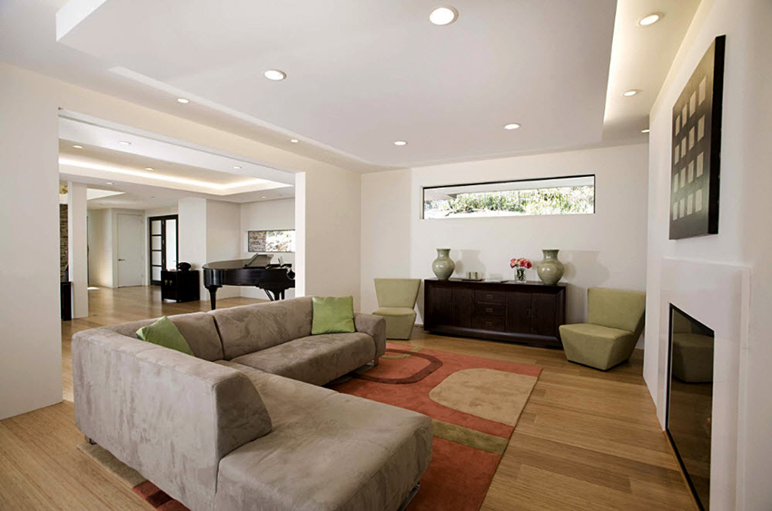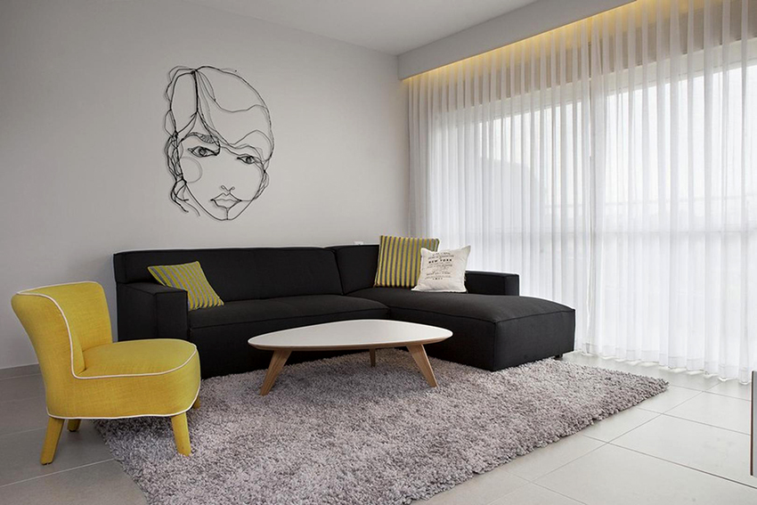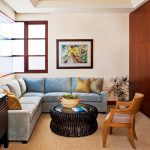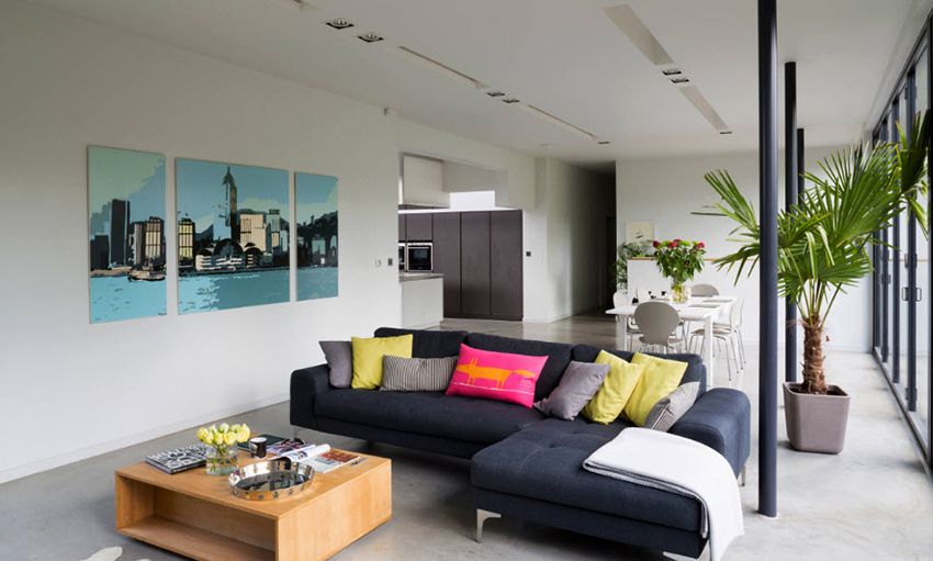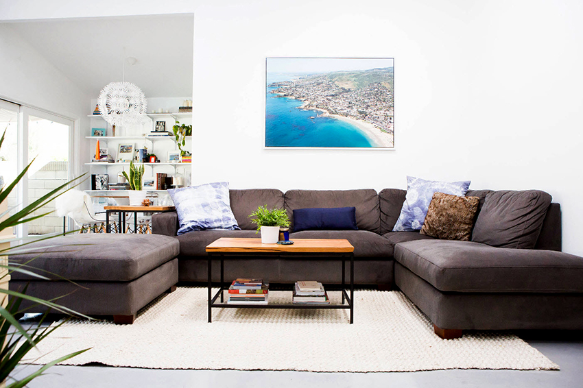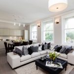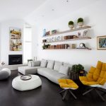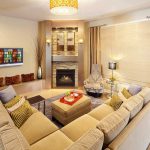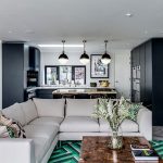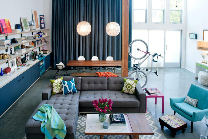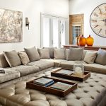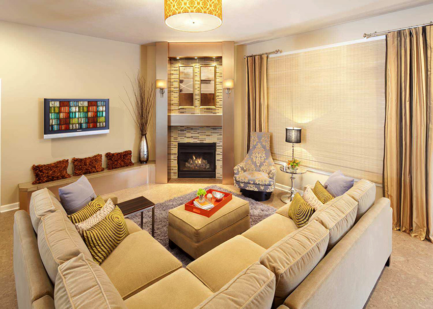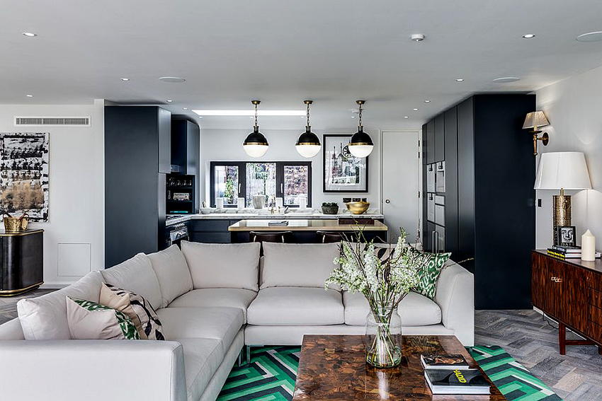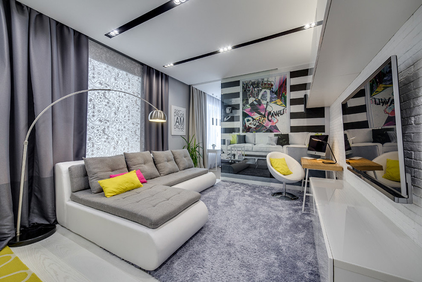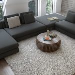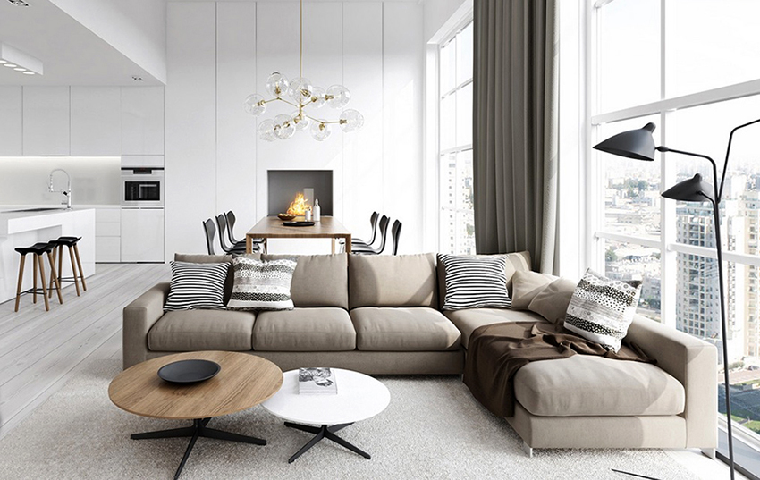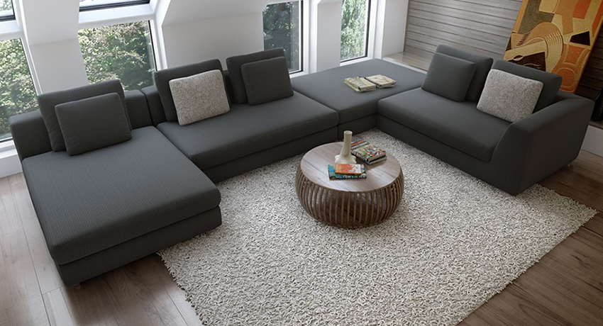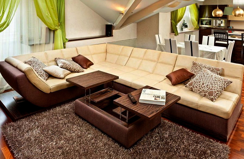 Bilang karagdagan, maaaring mabili ang mga sofa na hugis U. Ginagamit ang mga ito para sa pag-zoning sa mga silid na bukas ang plano kung saan pinagsama ang mga puwang ng dalawang silid, halimbawa: