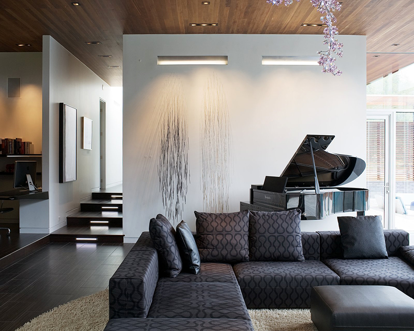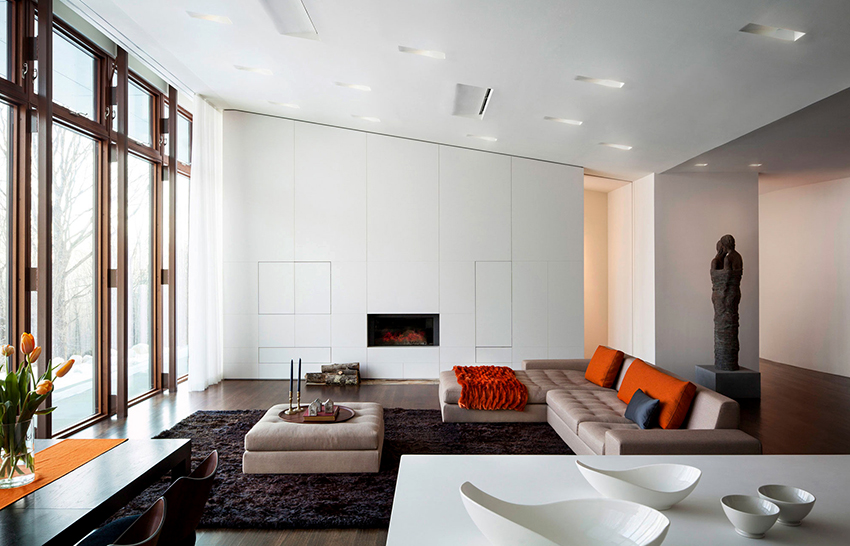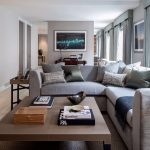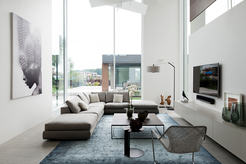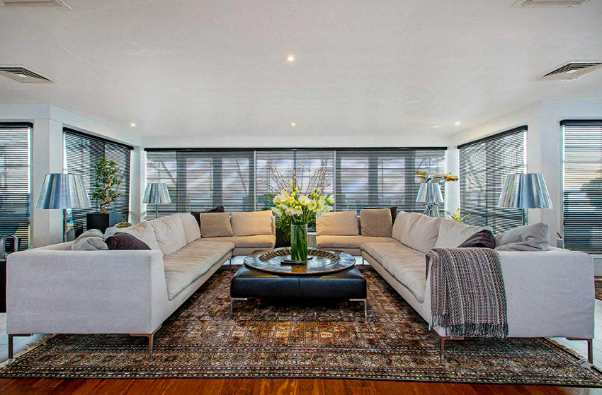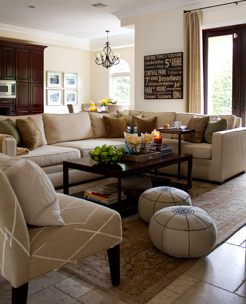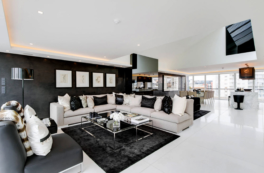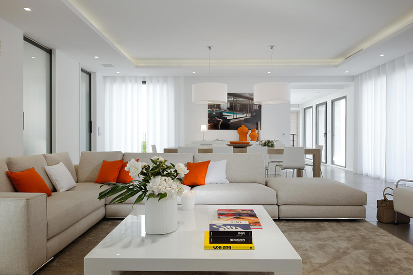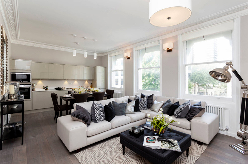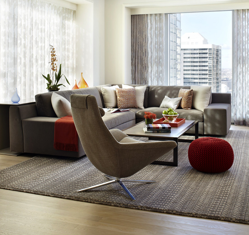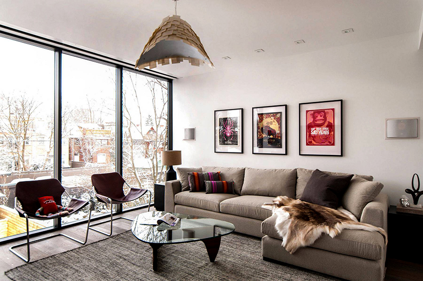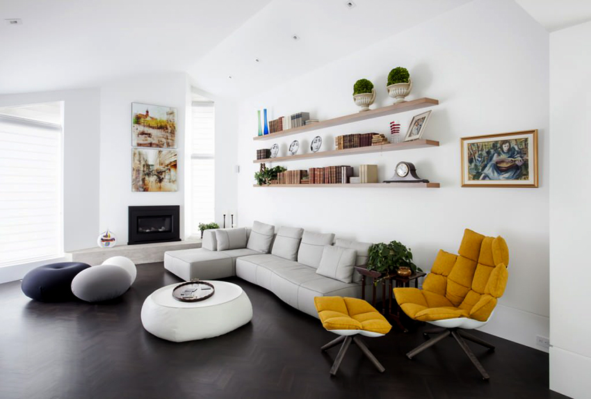 Bilang karagdagan, maaaring mabili ang mga sofa na hugis U. Ginagamit ang mga ito para sa pag-zoning sa mga silid na bukas ang plano kung saan pinagsama ang mga puwang ng dalawang silid, halimbawa: