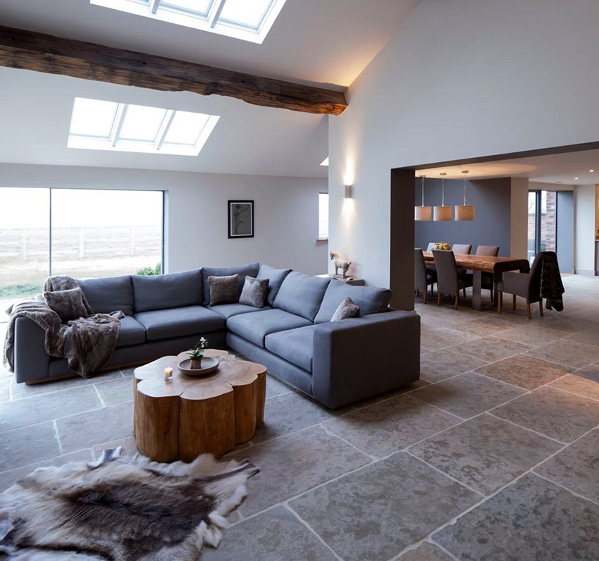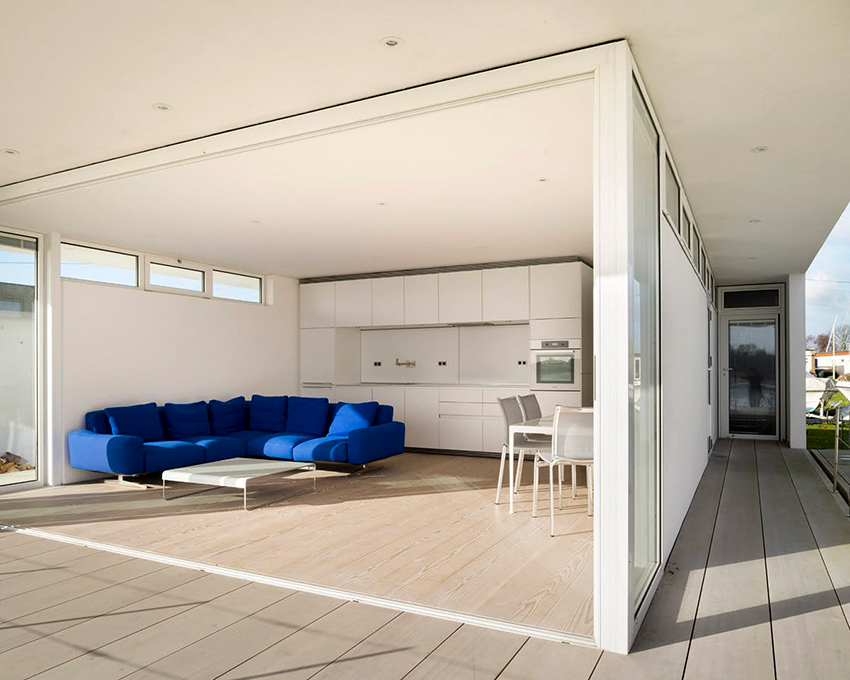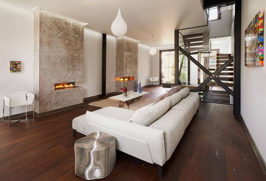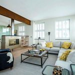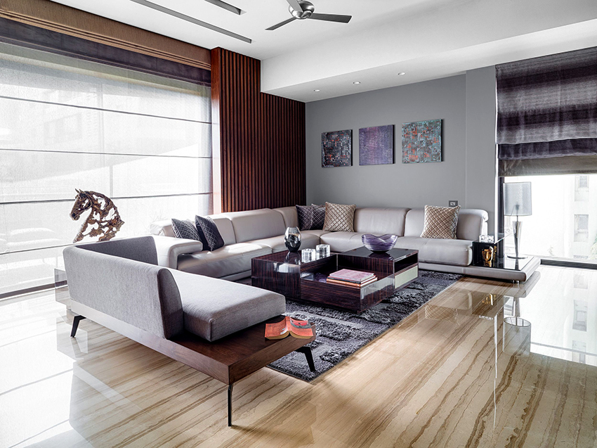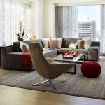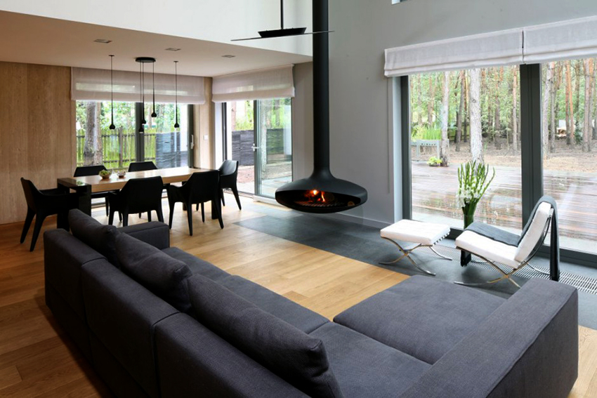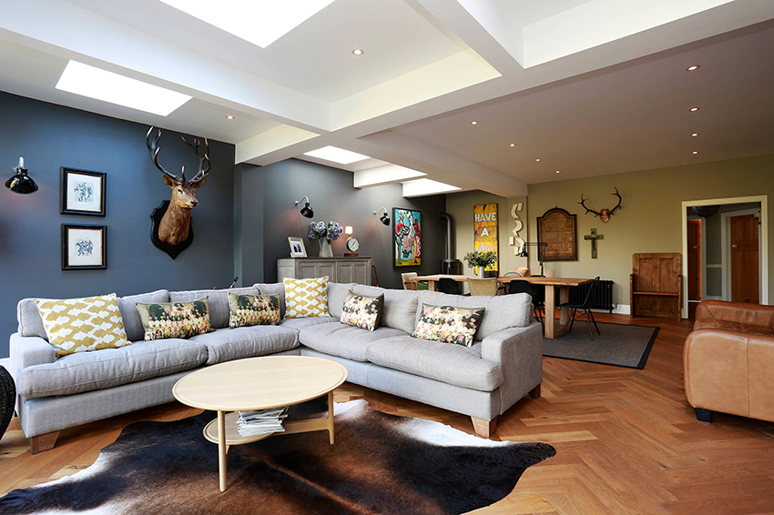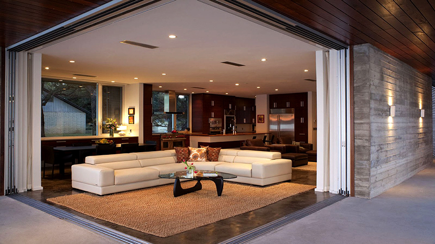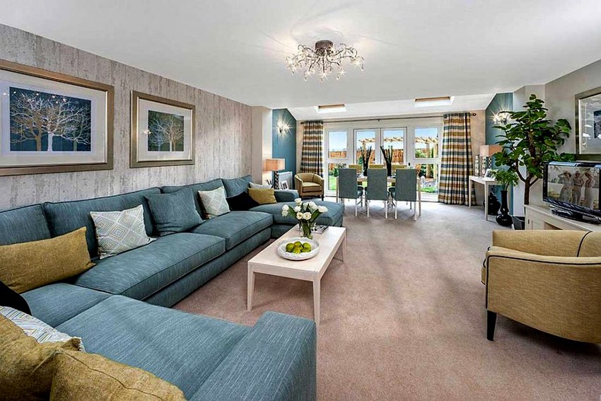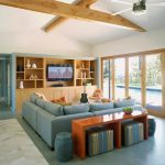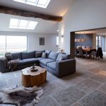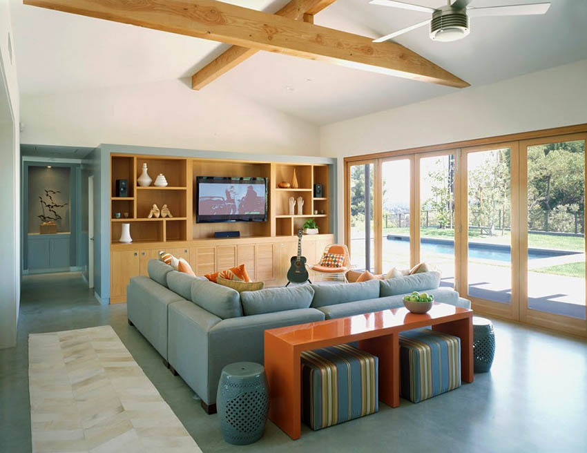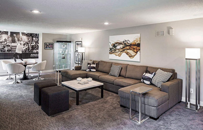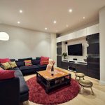 Bilang karagdagan, maaaring mabili ang mga sofa na hugis U. Ginagamit ang mga ito para sa pag-zoning sa mga silid na bukas ang plano kung saan pinagsama ang mga puwang ng dalawang silid, halimbawa: