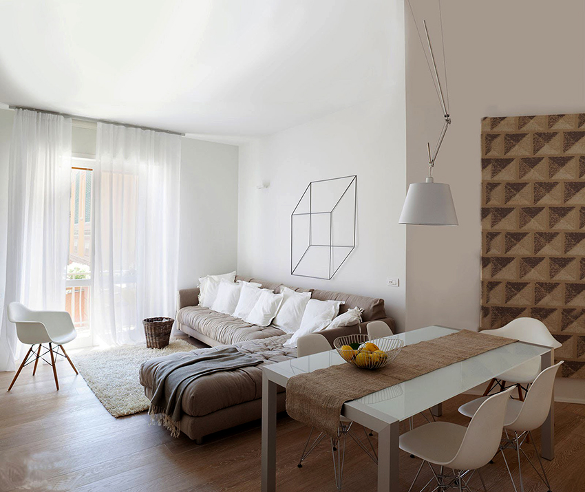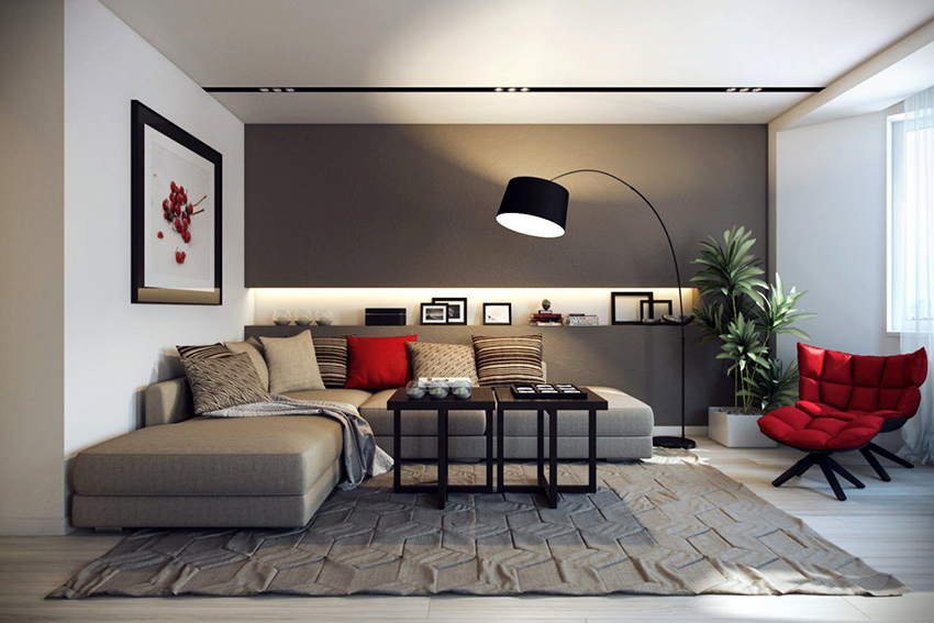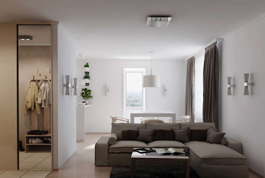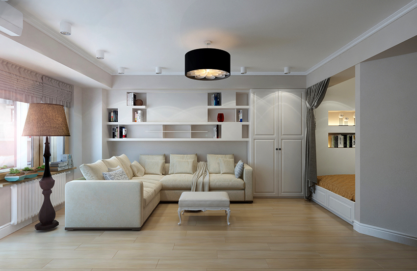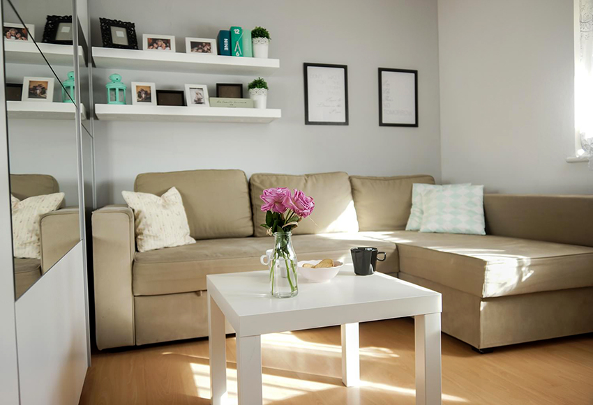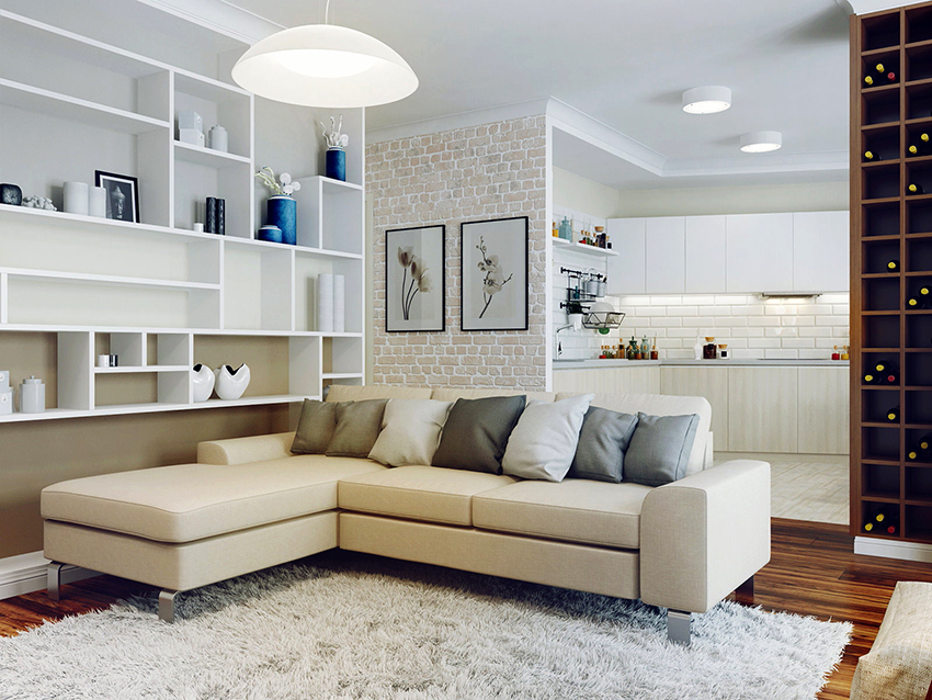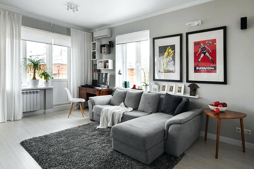 Kapaki-pakinabang na payo! Kung ang mga dingding ay pinalamutian ng maliliwanag na kulay o pinalamutian ng mga burloloy, ang sofa, sa kabaligtaran, ay dapat na pinalamutian ng mga walang kinikilingan na kulay, tulad ng kulay-abo, murang kayumanggi, kape o puti. Ang ilaw na tapiserya ay gagawing mas magaan ang istraktura. Ang pagpipiliang ito ay hindi angkop para sa mga sala na pinagsama sa isang kusina, dahil ang mga batik ay makikita sa gayong ibabaw.