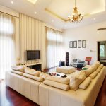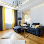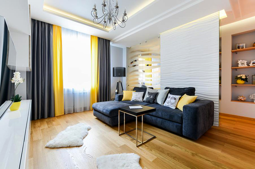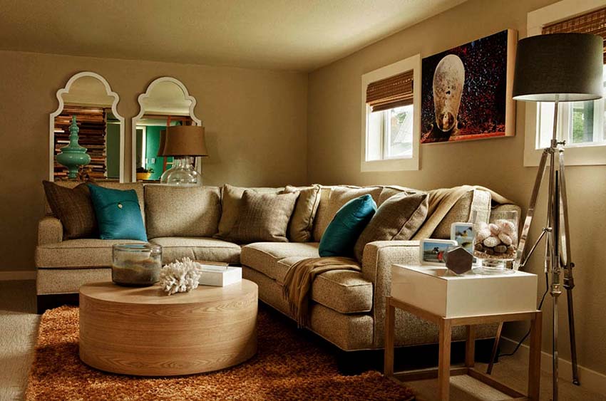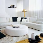 Kung balak mong gumamit ng puti, kakailanganin mong maingat na isaalang-alang ang disenyo ng isang silid na may sulok na sopa upang ang kasangkapan ay hindi pagsamahin sa mga ilaw na dingding, halimbawa, maaari kang mag-hang ng isang pandekorasyon na panel. Ang pinong beige at cream shade ay mukhang natural sa interior. Ang mga ito ay angkop para sa paglikha ng isang nakakarelaks na kapaligiran. Upang gawing mas makahulugan ang dekorasyon, maaari kang magdagdag ng itim, asul-asul at mga blueberry shade (ang pangunahing bagay ay hindi upang labis na labis ito). Kung ang panloob ay pinangungunahan ng madilim na kulay, ang takip sa sahig ay dapat na ilaw, kung hindi man ang kapaligiran ay magiging masyadong madilim.