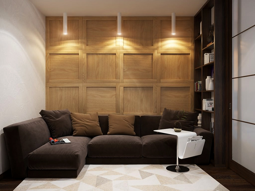 Kapaki-pakinabang na payo! Ang ilang mga modelo ng sofa ay may pandekorasyon at pagganap na mga bahagi na gawa sa kahoy (mga istante, mesa, armrest) o metal (mga binti, mga elemento ng pagkonekta). Upang gawing maayos ang panloob na hitsura, ang mga materyal na ito ay dapat opsyonal na maisama sa mga kagamitan.