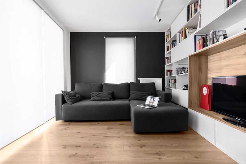 Ang sofa sa sala na may lugar na natutulog at isang mekanismo ng natitiklop na "Book"