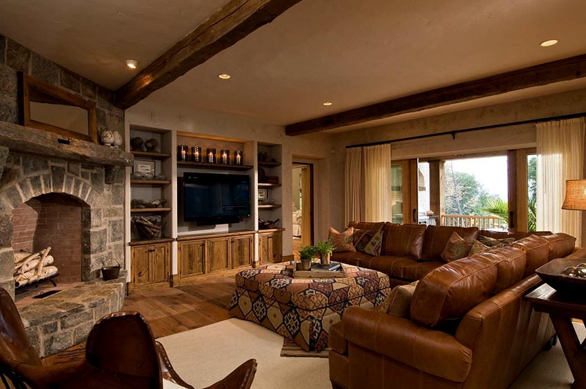 Ang mga sofa na istilo ng bansa ay may isang simpleng disenyo at isang magaspang na hugis na pinangungunahan ng mga tuwid na linya. Walang polish o barnis sa mga kahoy na elemento. Ang headset ay karaniwang may artipisyal na edad na hitsura. Para sa tapiserya, ginagamit ang mga materyales na pinalamutian ng maliliit na pattern. Ang patination, pagpipinta at brushing ay hinihimok sa disenyo.