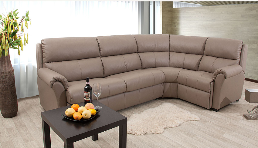 Kung ang silid ay may sapat na halaga ng libreng puwang, hindi kinakailangan na bumili ng isang sofa ng tamang hugis ng geometriko. Ang mga modelo na may isang kalahating bilog na disenyo at mabilis na tapiserya ay magiging isang mahusay na pagpipilian para sa pag-aayos ng isang komportableng lugar ng pahingahan.