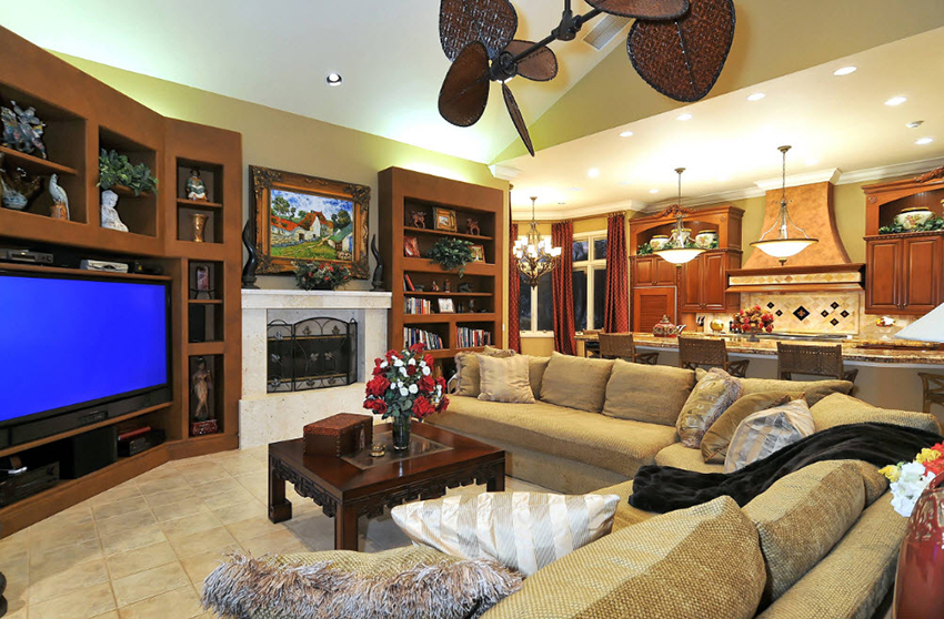 Ang bulwagan ay ang mukha ng bahay, samakatuwid sa larawan ng sulok mga sofa sa loob ng sala maaari mong makita ang mga napapakitang modelo na may maraming bilang ng mga kumportableng lugar ng pag-upo para sa mga panauhin. Ang pinakamahusay na pagpipilian para sa pag-aayos ng isang lugar ng pag-upuan sa harap ng TV sa bulwagan ay magiging isang hugis L na supa, na nilagyan ng isang mesa ng kape.