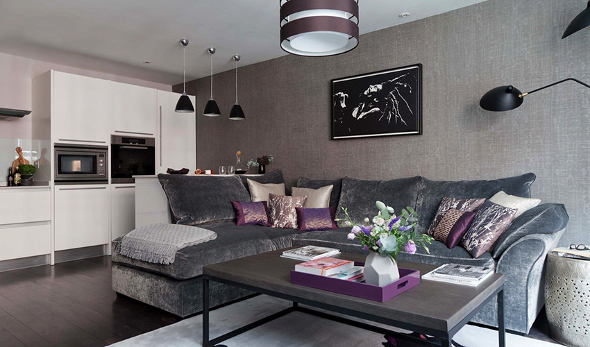 Ang mga interior na may sulok na sofa sa sala, silid-tulugan at kusina