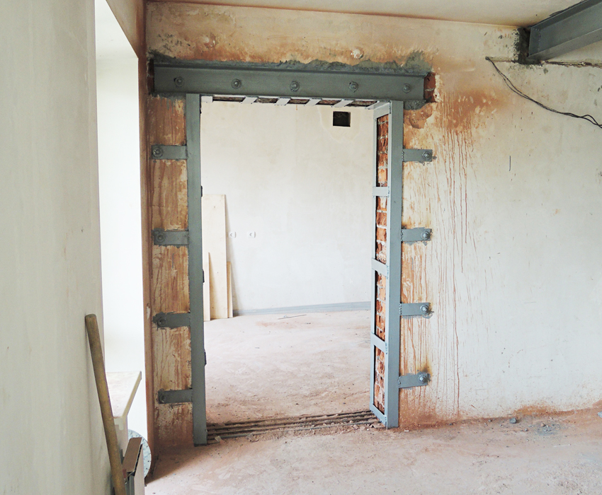 Ang pinaka-karaniwang solusyon upang mabawasan ang laki ng pagbubukas ng 5 cm ay ang paggamit ng mga sulok ng bakal. Gumagana ang mga ito bilang isang corrective frame. Isinasagawa ang pagpupulong nito gamit ang kagamitan sa hinang, pagkatapos kung saan ang istraktura ay tinatakan ng semento mortar.