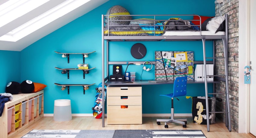 Ang isa sa mga makatuwiran na solusyon para sa paggamit ng puwang ay isang bunk bed. Kung malaki ang pagkakaiba sa edad ng mga lalaki, maaari kang gumamit ng isang loft bed para sa iyong nakababatang kapatid, at ilagay ang isang ganap na lugar na natutulog para sa isang mas matandang bata sa ilalim nito. Ang pag-aayos na ito ay nagdaragdag ng puwang para sa pag-aayos ng isang sistema ng imbakan o isang malikhaing at lugar ng trabaho.