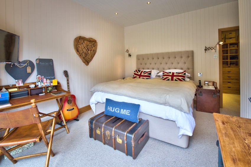 Teknikal na disenyo... Maraming mga lalaki ang mahilig sa iba't ibang kagamitan, tulad ng mga kotse, eroplano, tank, tren, sasakyang pangalangaang. Ang libangan na ito ay madaling mailipat sa disenyo ng silid ng mga bata para sa isang tinedyer na lalaki, ang larawan ay isang malinaw na kumpirmasyon nito. Ang mga homemade na kahoy na modelo ng kagamitan, mga maliliwanag na poster at poster, malalaking mga laruan na may temang ay magiging masusuring.