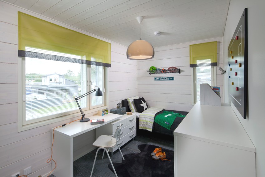 Kung ang iyong anak na lalaki ay iginigiit ng maitim na lilim sa disenyo ng silid, kung gayon ang mga maliliwanag, kaakit-akit na tela ay magiging angkop, kung saan ang silid ng mga bata para sa isang tinedyer na lalaki (malinaw na ipinapakita ito ng mga larawan) ay titigil na maging malungkot.