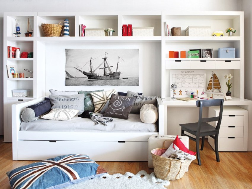 Para sa isang maliit na silid ng mga bata para sa isang lalaki, maaaring magamit ang mga mobile kasangkapan. Maaari itong maging mga natitiklop na sofa, mga kama na may mga built-in na drawer, mga pull-out na kama, mga kama sa armchair, mga mesa ng libro, mga mesa ng natitiklop, maraming gamit mga sulok na sofa, mga mobile na istante na madaling mabago sa mga libro o kagamitan sa palakasan, mga pouf na may panloob na espasyo sa pag-iimbak. Ang mga nakasabit na bukas na istante ay maganda sa mga maliit na silid.