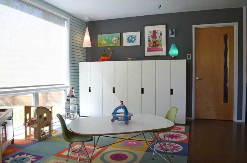 Sa silid, kinakailangan upang magbigay ng mas maraming puwang para sa karagdagang pag-unlad at pagkamalikhain ng bata. Ang lugar ng paglalaro ay dapat na maluwang at maliwanag. Ang lahat ng kinakailangang bagay at laruan ay maaaring itago sa maginhawang mababang mga istante o sa mga drawer na may isang limiter.