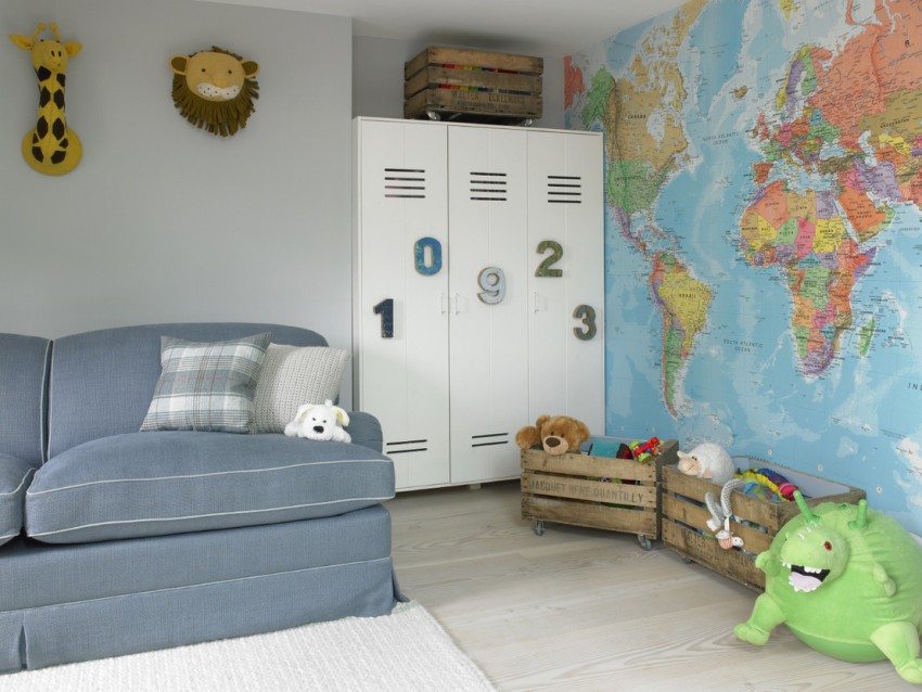 Maraming mga bata ang mahilig maglakbay at tuklasin ang iba't ibang mga bansa. Sa kasong ito, ang isang pangheograpiyang mapa ng mundo ay maaaring mailagay sa isa sa mga dingding, at ang panloob ay maaaring dagdagan ng isang mundo. Ang nasabing ideya ay kapwa kawili-wili at kapaki-pakinabang para sa bata. Malinaw mong nakikita ang pasyang ito sa larawan ng disenyo ng silid ng mga bata para sa isang batang lalaki na 10 taong gulang.