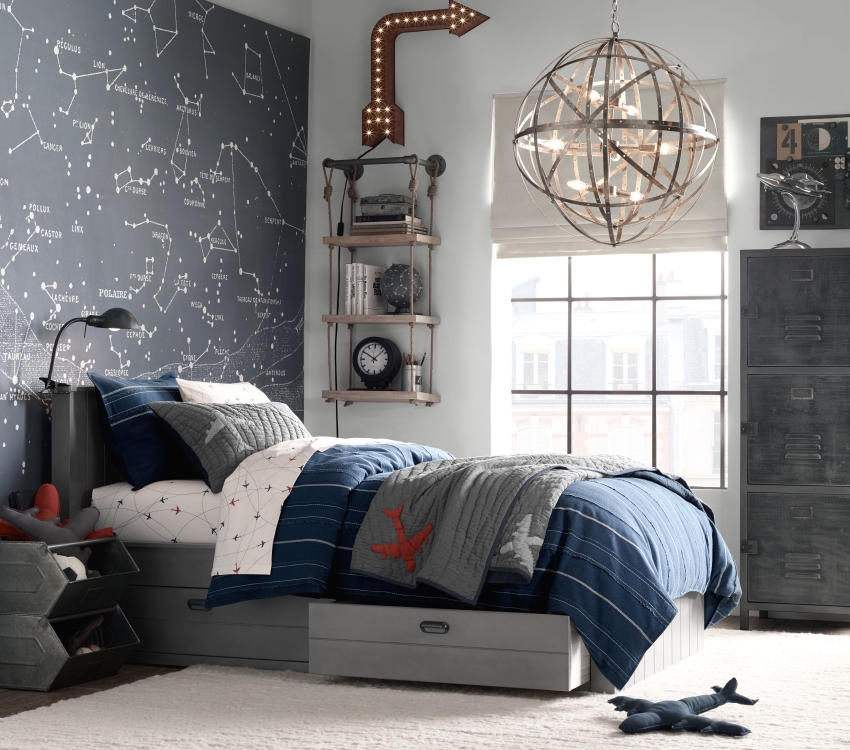 Space... Kung ang isang bata ay interesado sa lahat ng nauugnay sa espasyo, pagkatapos ay maaari kang lumikha ng isang bituon na kalangitan sa kisame sa silid ng mga bata para sa isang batang lalaki na gumagamit ng espesyal na ilaw o wallpaper na kumikinang sa dilim. Maaari kang bumili ng isang chandelier sa anyo ng isang lumilipad na platito, isang kama na mukhang isang sasakyang pangalangaang sa silid ng isang bata para sa isang batang lalaki, lumikha ng isang naaangkop na pag-print sa mga tela ng kama at mga kurtina, gumamit ng mga kulay na bakal na mga kabit para sa mga kasangkapan. Ang isa sa mga pader ay maaaring gawin sa anyo ng isang parada ng mga planeta gamit ang wallpaper ng larawan.
