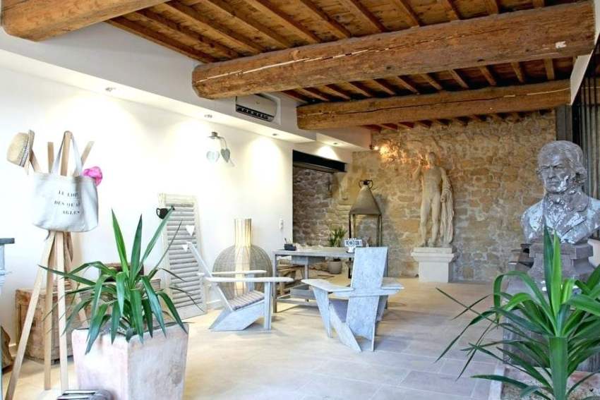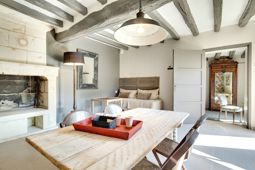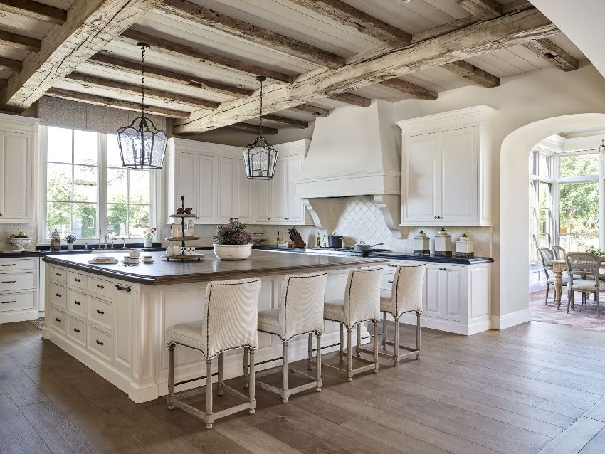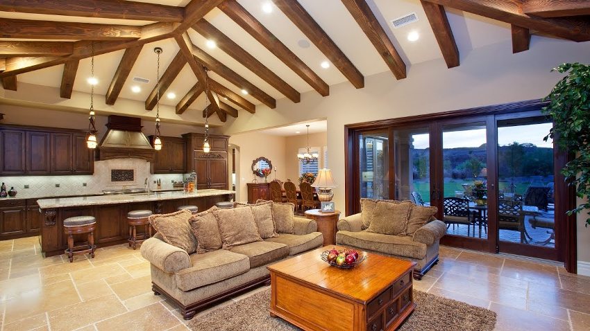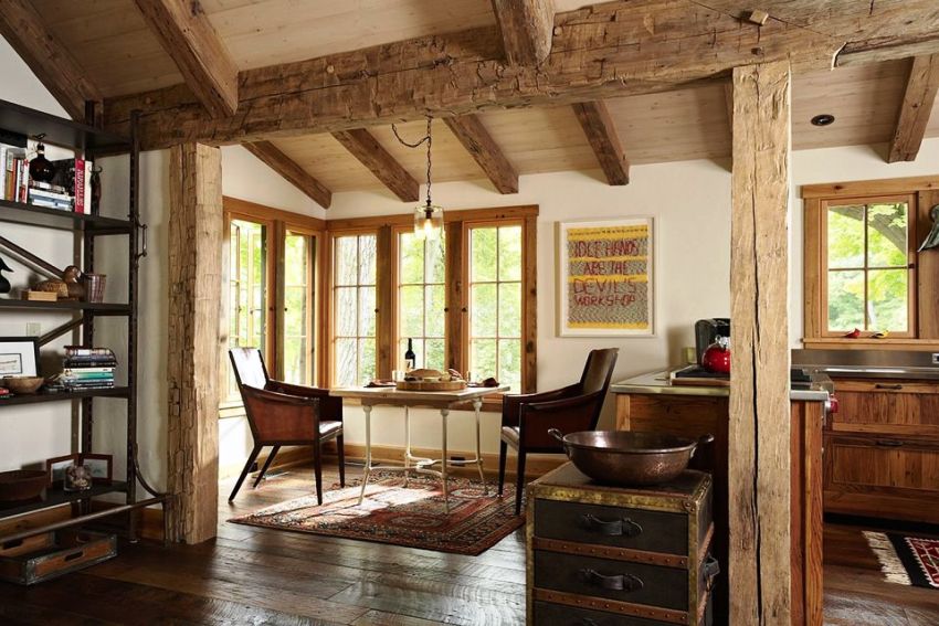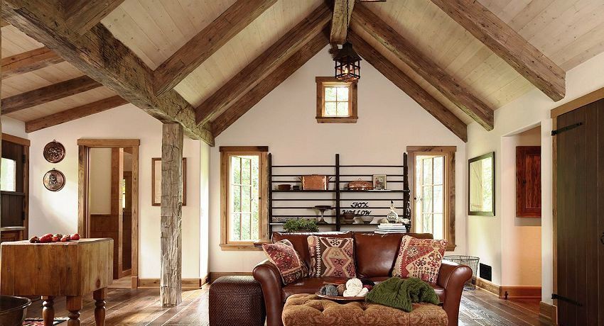 Ang mga nakalantad na beam sa kisame ay makakatulong lumikha ng isang natatanging estilo ng isang bahay sa bansa, halimbawa, isa sa mga istilo ng bansa