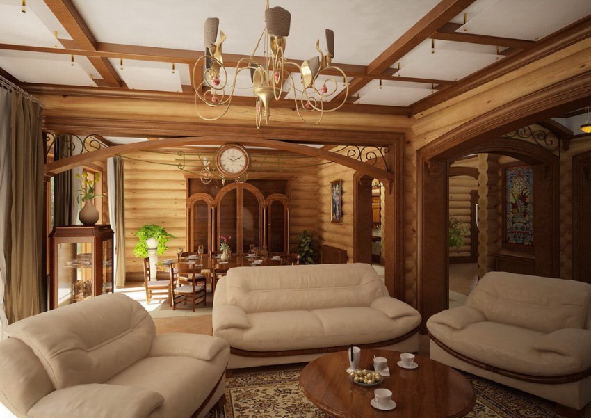 Disenyo ng mga kisame sa mga kahoy na bahay: larawan modernong interior