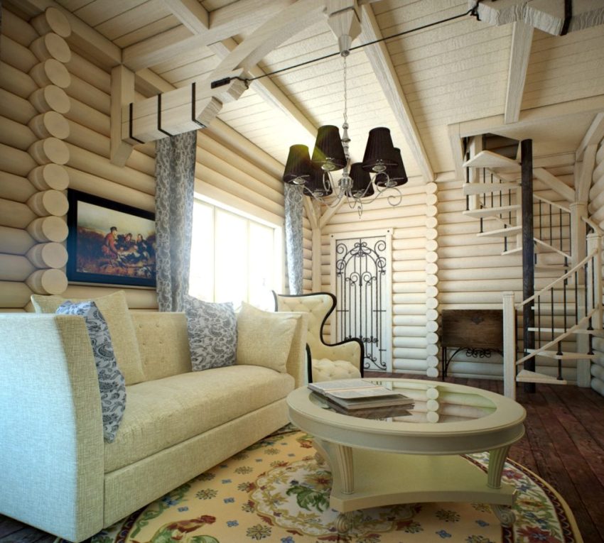 Ang mga kisame sa isang kahoy na bahay ay dapat na tumutugma sa pangkalahatang estilo at magkaroon ng disenteng hitsura