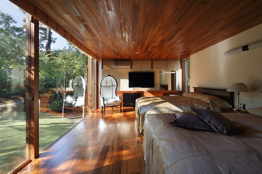 Ang istilong Hapon ay mas kakaiba, kahit na ito ay hinihiling sa mga dekorador. Ang pangunahing mga materyales sa pagtatapos ay bato at kahoy. Sa kasong ito, dapat ibigay ang espesyal na pansin sa mga kisame. Maaari silang sarhan ng kahoy na paneling o mga madilim na kulay na tabla.