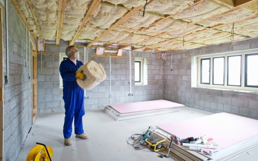 Ang proseso ng pagkakabukod ay nagsisimula sa leveling at paglilinis sa ibabaw ng magaspang na kisame. Ang rock wool sa mga rolyo ay maaaring magamit bilang isang insulator. Pagkatapos ng isang hindi tinatagusan ng tubig na pelikula ay naayos sa malinis na ibabaw. Upang gawing solid ang patong, ang mga sheet ng materyal na hindi tinatablan ng tubig ay nag-o-overlap, at ang overlap ay dapat na karagdagan na nakadikit sa espesyal na tape ng malagkit.