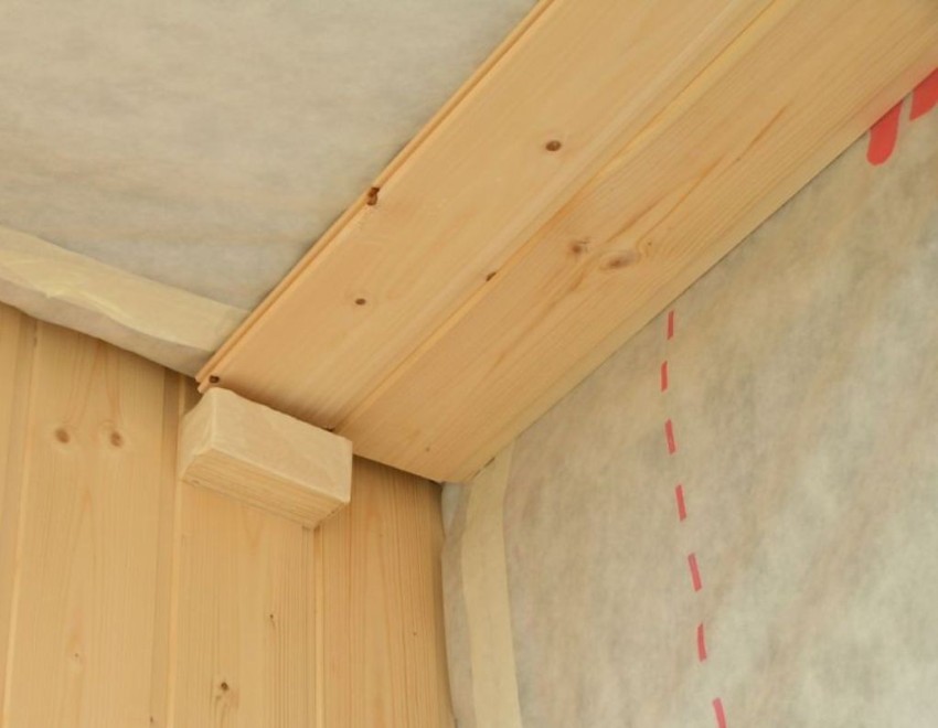 Sa ibabaw ng kisame, isang frame ang itinayo para sa pag-install ng hinaharap na pagtatapos ng mga kisame na gawa sa kahoy. Para sa paggawa ng lathing, maaari kang gumamit ng isang kahoy na beam o mga elemento ng profile na metal. Ang mga bahagi ng konstruksyon ay naka-install sa isang paraan na ang distansya sa pagitan ng mga ito ay 10-20 mm mas mababa kaysa sa lapad ng roll. Salamat dito, ang materyal na pagkakabukod ay mapagkakatiwalaan na gaganapin sa loob ng frame. Ang cotton cotton ay inilalagay sa puwang sa pagitan ng mga profile o mga kahoy na beam. Ang kapal ng pagkakabukod ay hindi dapat mas mababa sa 5 cm.