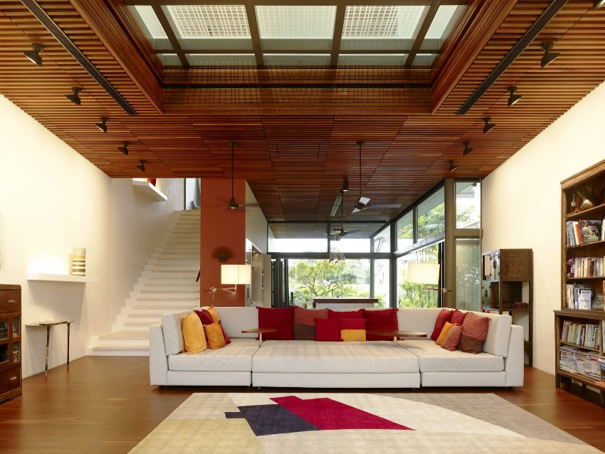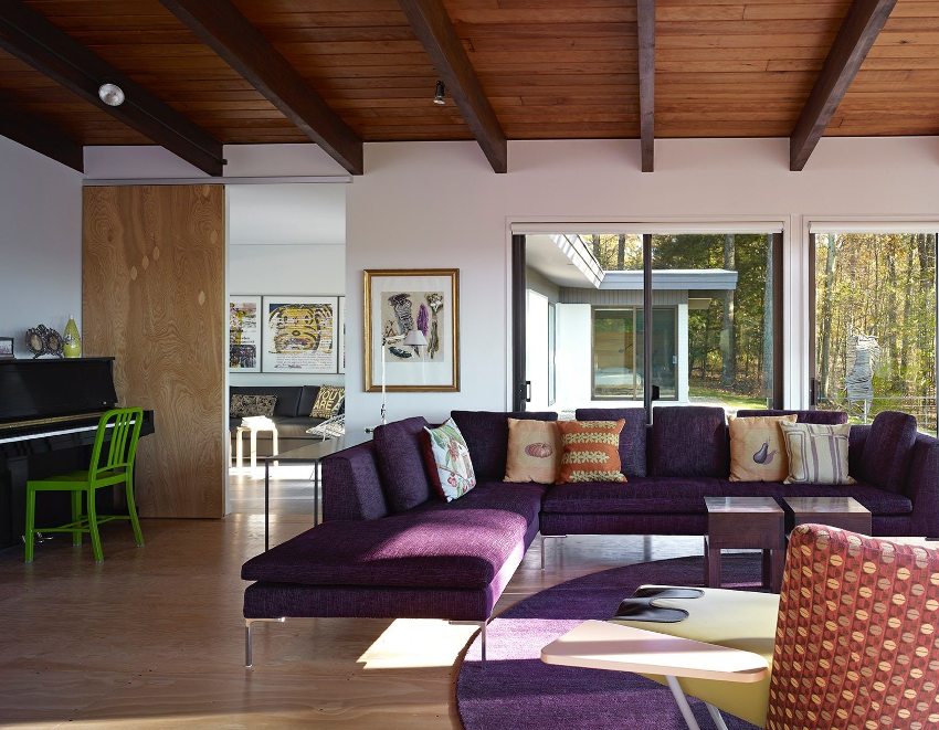 - Ang puwang sa pagitan ng mga beams ay ginagamit bilang isa sa mga elemento ng disenyo.
