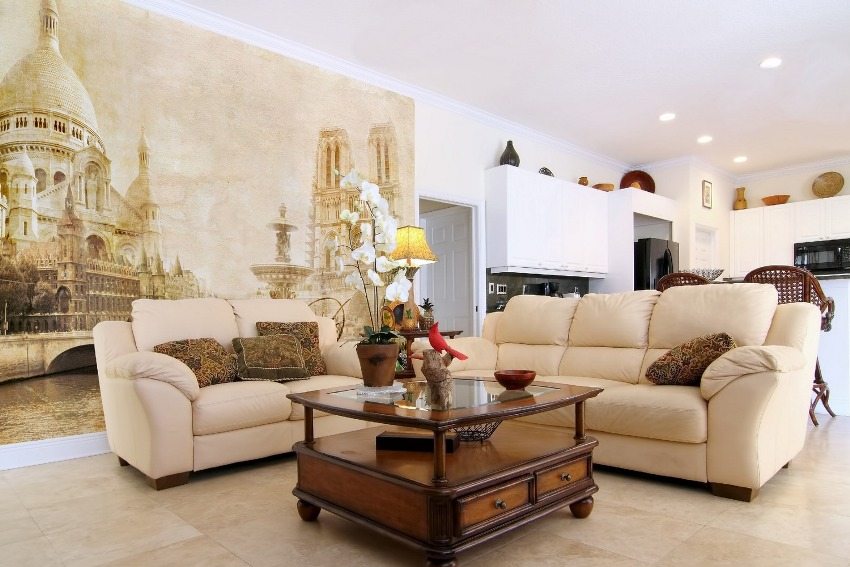 Ang taga-disenyo ng salamin na wallpaper na may isang naka-print na pattern sa loob ng isang modernong sala