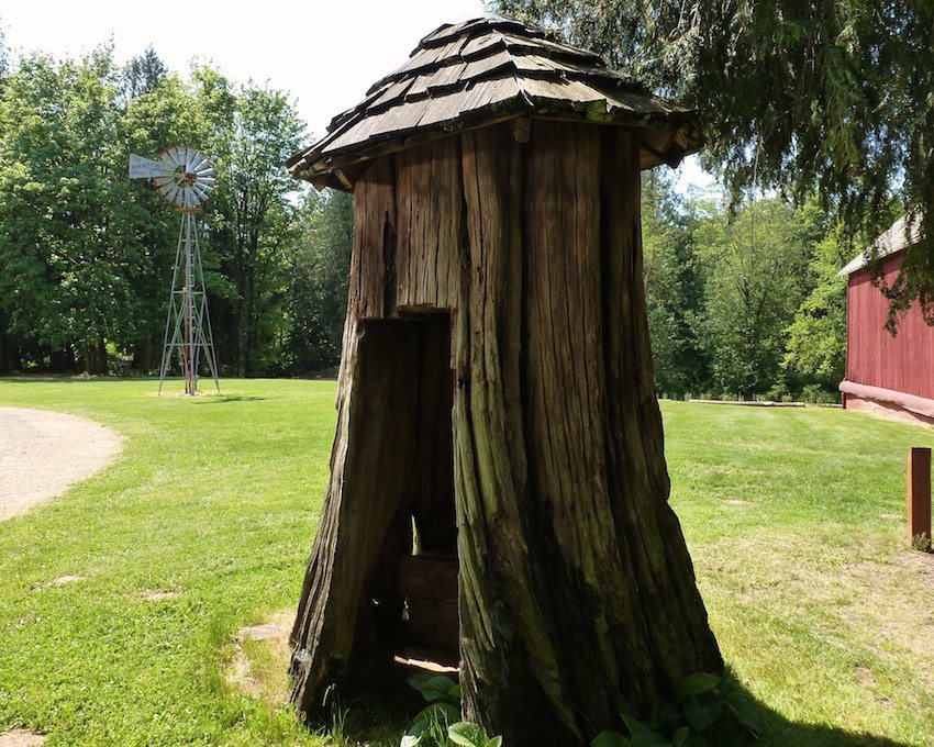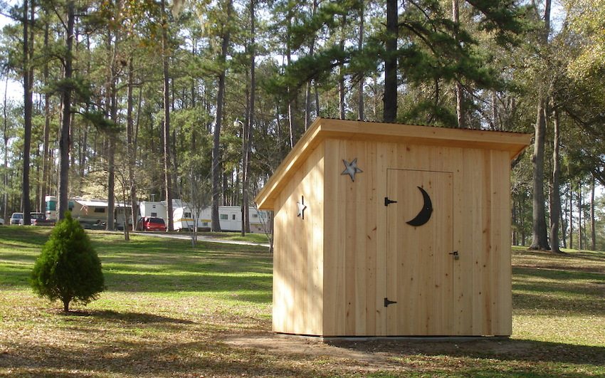 - Ang isang ordinaryong banyo na may isang poop pit ay mukhang isang booth na naka-install sa itaas ng isang hukay, hindi bababa sa 1.5 m ang lalim. Ang booth ay gawa sa anumang materyal mula sa mga tabla hanggang sa plastik. Ang ibabaw ng mga pader at ang ilalim ng septic tank ay pinalakas upang maiwasan ang pagbagsak. Ang mga karumihan ay aalisin kung kinakailangan. Ang posisyon ng pag-upo ay nakaayos sa anyo ng isang upuan o isang butas ay simpleng ginawa sa sahig;