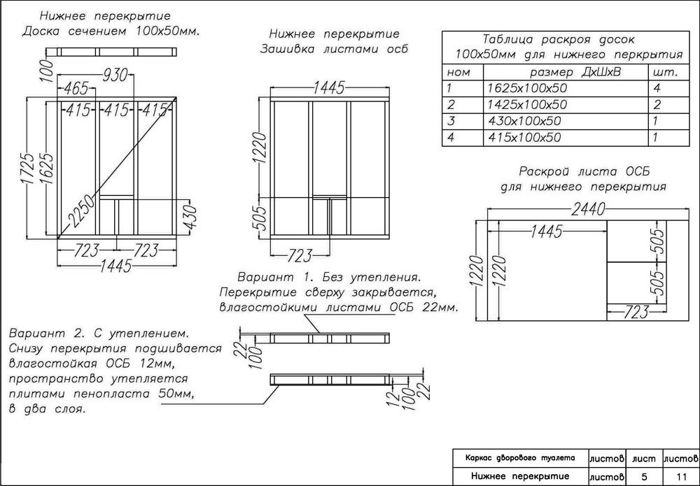 - ang sahig ay tipunin mula sa mga board na 50x100 mm at natahi mga sheet ng OSB... Kung kinakailangan, ito ay insulated ng foam. Ang cesspool ay nakaayos sa likod ng banyo;