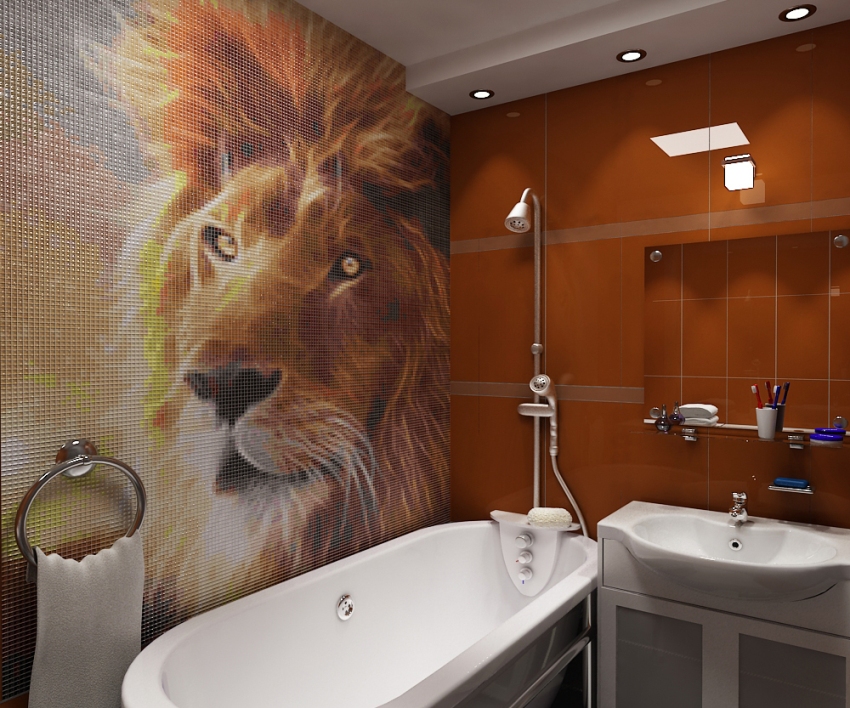Taş veya ahşabı taklit eden dokulu mozaikle süslenmiş duvar orijinal görünüyor. Banyo için ideal çözüm, doğal taştan yapılmış karoların döşenmesidir. Fon kıtlığı durumunda, daha ucuz bir yapay taş da kullanabilirsiniz.