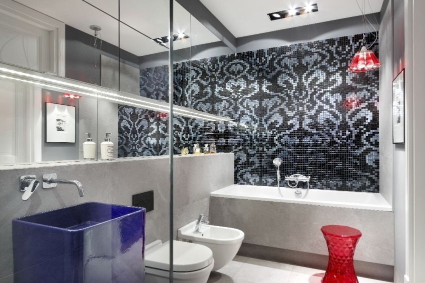 Çok renkli mozaiklerin kullanımı çok popüler. Farklı tonlarda dekore edilmiş banyo şık ve göze hoş görünmektedir. Bununla birlikte, bu durumda, kategorik olarak üçten fazla gölgeyi birleştirmenin tavsiye edilmediği unutulmamalıdır.