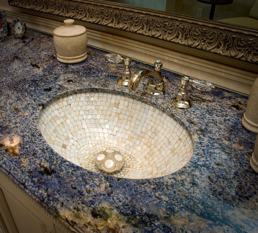 Bir banyo için mozaik seçerken, çeşitli malzemelerden yapıldığını da hatırlamakta fayda var. Her birinin kendine has özellikleri vardır. Bu tür kaplamaların yardımıyla, sadece odanın dikey ve yatay yüzeylerini değil, aynı zamanda iç mekanın bireysel unsurlarını da dekore edebilirsiniz.