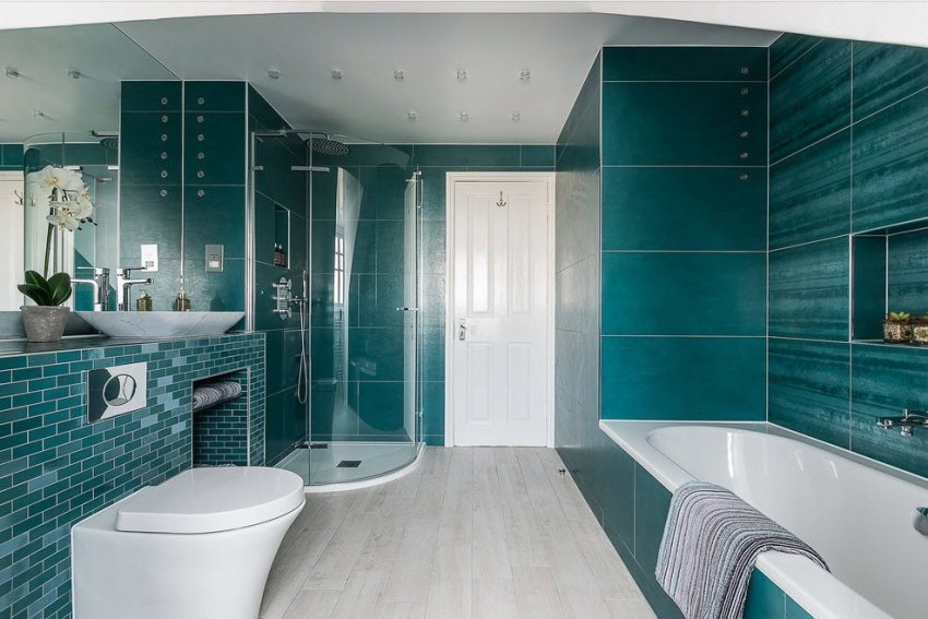 Tek renkli.Bu durumda, aynı gölgedeki fayanslar dikey veya yatay bir yüzeye döşenir. Çoğu zaman aynı boyutta ve şekle sahiptir. Bu tasarım çözümü, minimalist bir banyo oluşturmak için uygundur.