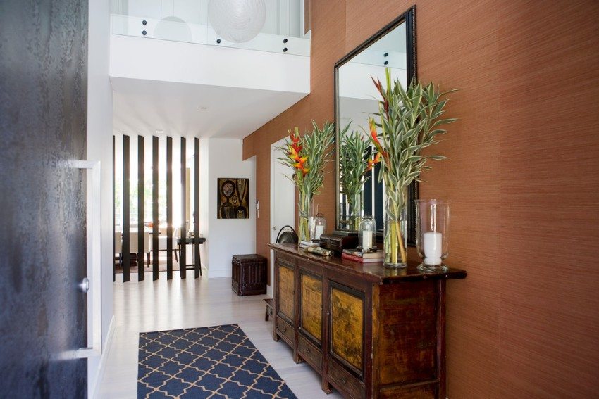 Faydalı tavsiyeler! Yardımla odayı görsel olarak büyütebilirsiniz panoramik duvar kağıdıtasarımı özgün ve çarpıcı hale getirirken. Bu teknik de ilginç: Uzun dar bir koridorun duvarları, zıt renklerde duvar kağıdı kullanılarak görsel olarak iki bölüme ayrılmıştır.