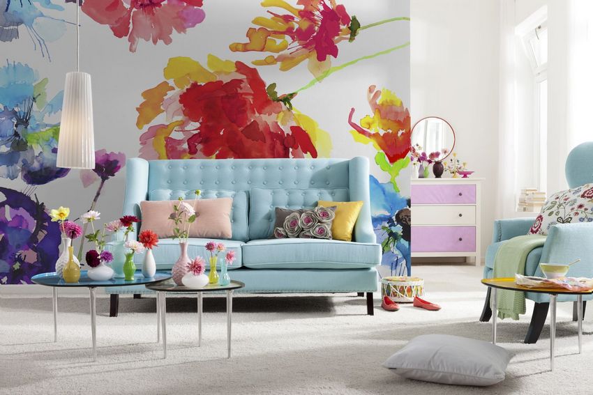 Bức tường của phòng khách được vẽ bằng màu nước bức vẽ