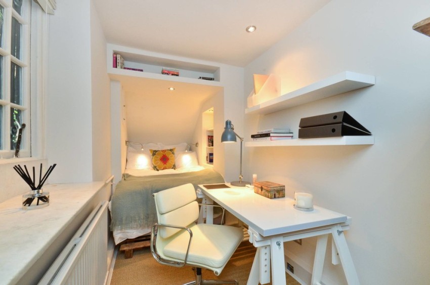 Nếu bạn cần sử dụng căn phòng như một nơi làm việc chính thức, bạn có thể lắp đặt giường với cơ chế gấp hoặc nâng.