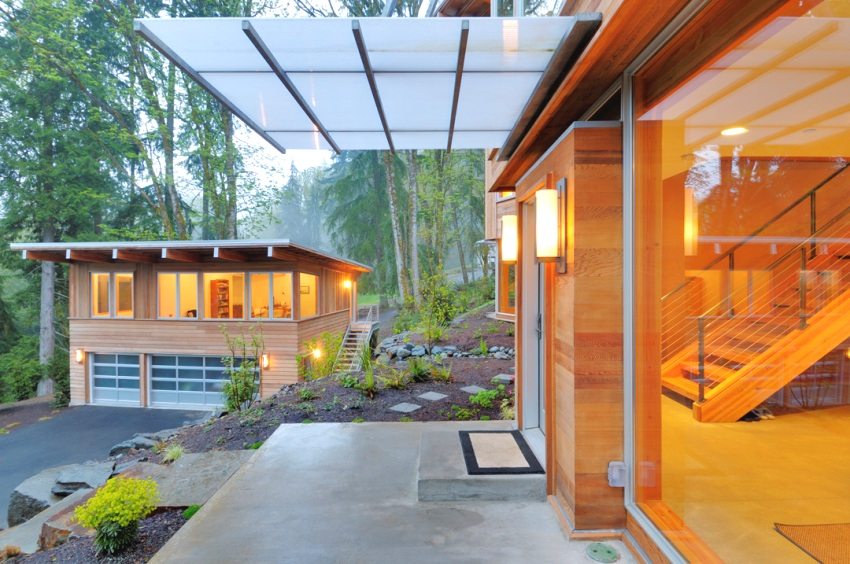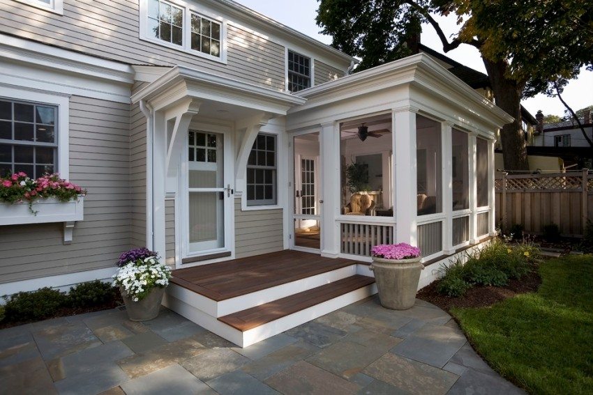 - Nếu một sự mở rộng được thiết kế riêng biệt, khi đó không cần thiết phải kết nối chắc chắn vào tường nhà. Tường và mái hiên có mức độ co ngót khác nhau và sự đan xen mạnh mẽ có thể gây biến dạng cấu trúc.