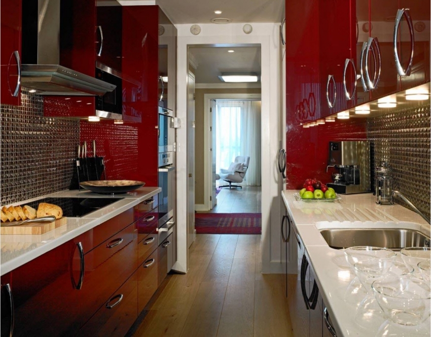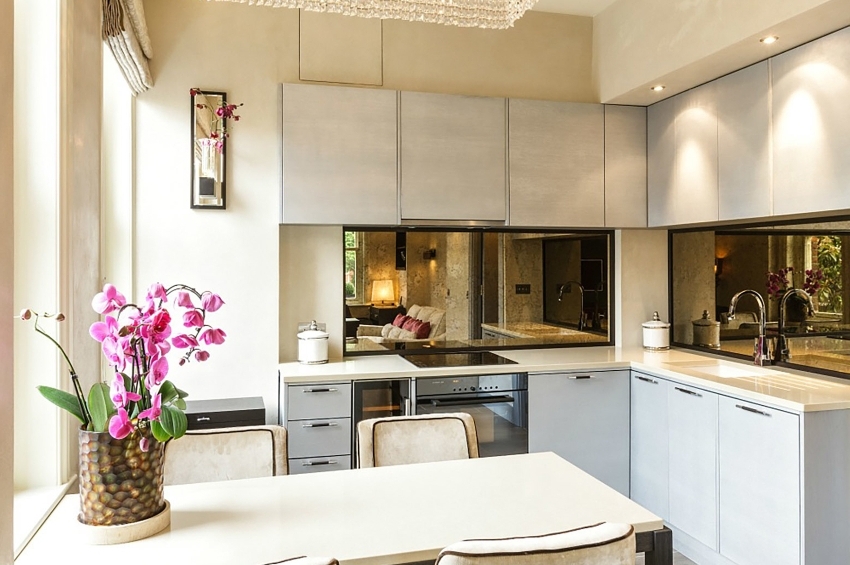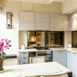 Xem xét diện tích nhỏ của nhà bếp như vậy, vật liệu bóng và phản chiếu, chẳng hạn như giấy dán kính, là phù hợp nhất để trang trí tường. Việc sử dụng gương và bề mặt gương trong nội thất cũng được khuyến khích, vì chúng sẽ giúp mở rộng không gian một cách đáng kể.