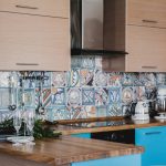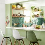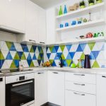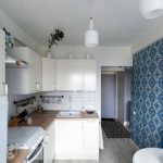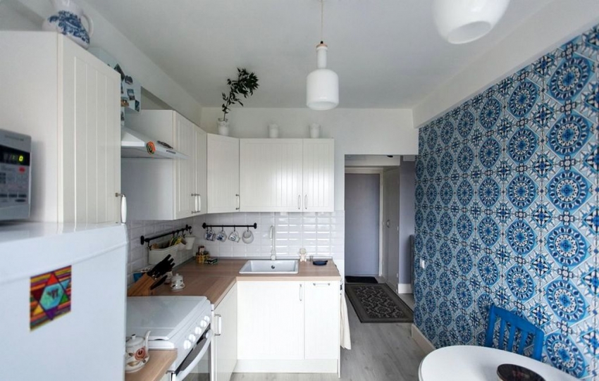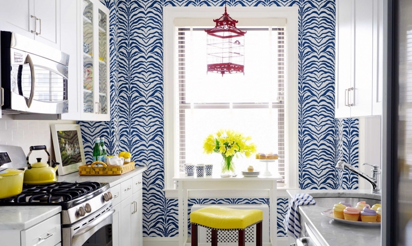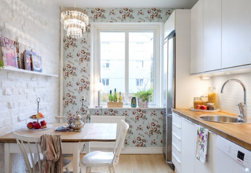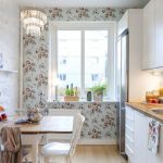 Một điểm nhấn tươi sáng dưới dạng giấy dán tường có hoa văn sẽ tạo cho căn bếp nhỏ một cái nhìn lễ hội