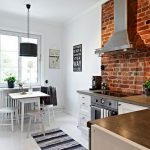 Như đã đề cập, các hình vẽ và hoa văn lớn là một ý tưởng tồi cho nội thất của căn bếp nhỏ trong tòa nhà Khrushchev, vì vậy nếu bạn muốn trang trí các bức tường, bạn có thể sử dụng một điểm nhấn, điểm nhấn này nên được đặt gần bàn và phân chia không gian một cách trực quan. Và để yếu tố như vậy trông không cô đơn, bạn có thể mua tạp dề nhà bếp có thiết kế tương tự, sẽ bổ sung cho nội thất.