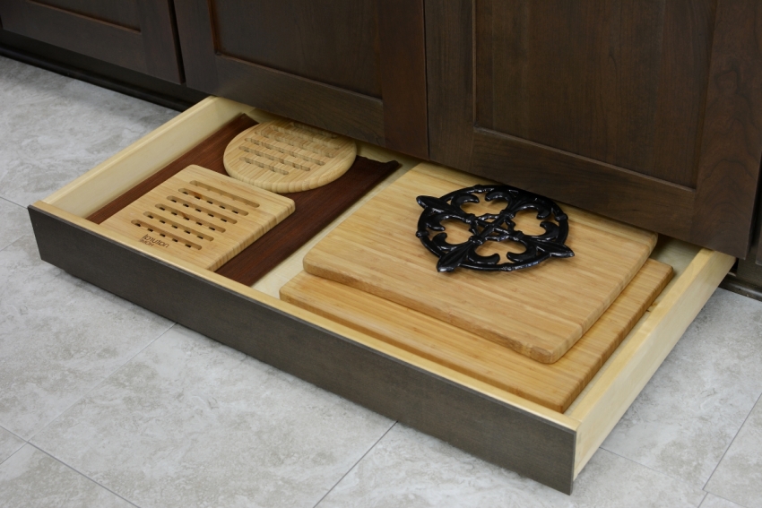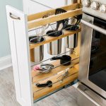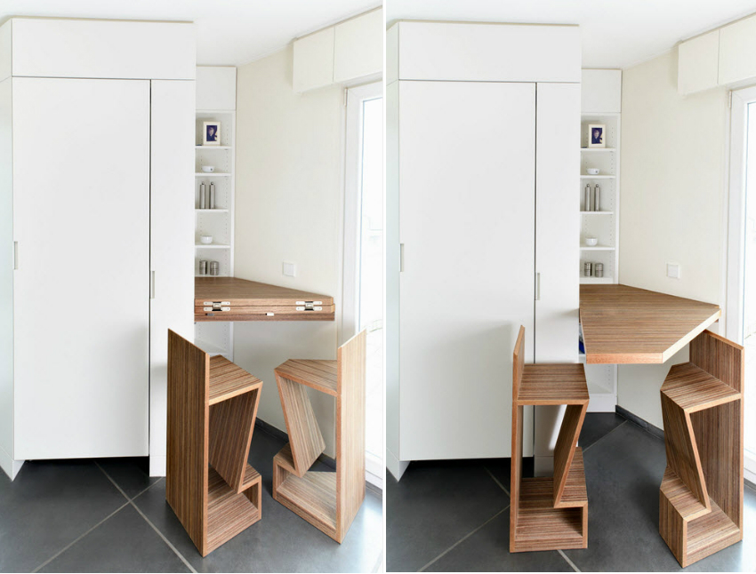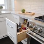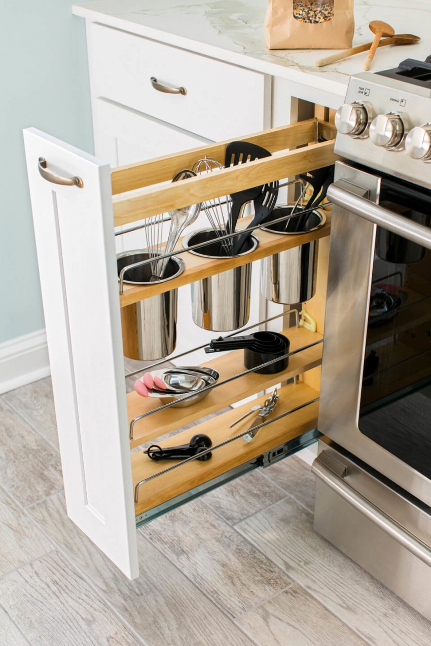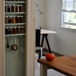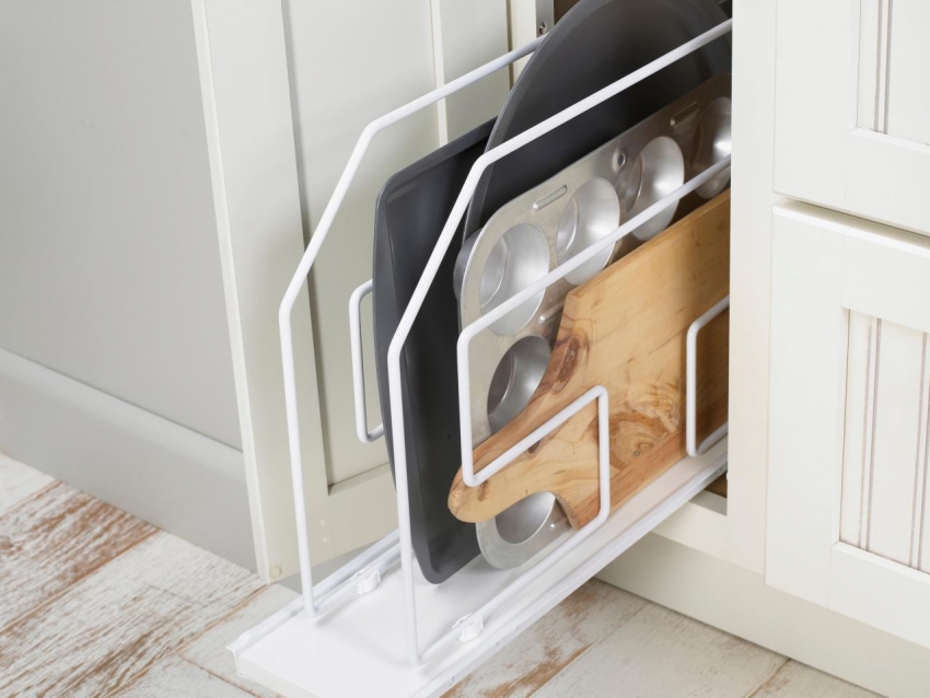 Có một thủ thuật khác cho phép bạn đồng thời kéo giãn không gian lên trên mà vẫn tạo thêm không gian lưu trữ. Đối với điều này, một bộ được đặt trong nhà bếp, bao gồm tủ hẹp và hộp đựng bút chì.