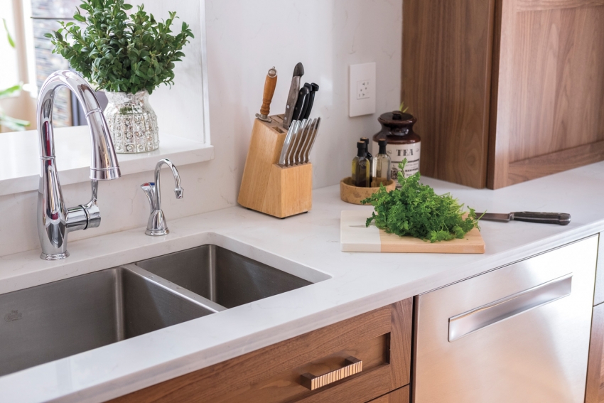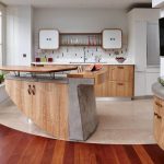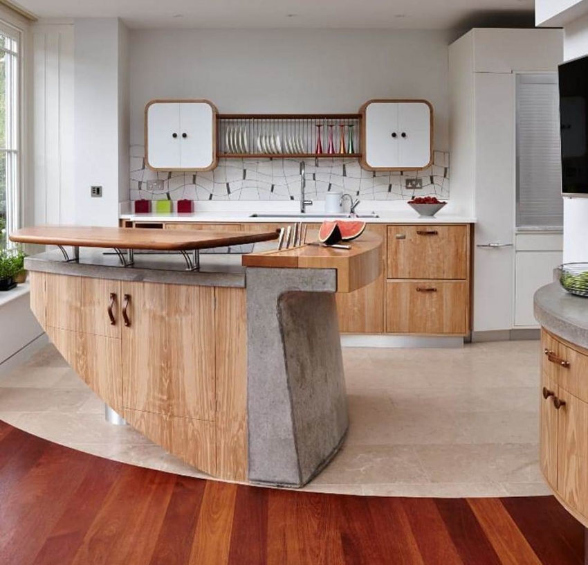 Kỹ thuật thiết kế hiện đại nhất nội thất nhà bếp là sự kết hợp của các vật liệu tự nhiên với bề mặt bóng trắng