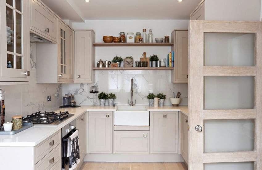 - tất cả các màu kem, be và xám là những màu tốt nhất để trang trí một căn bếp nhỏ;