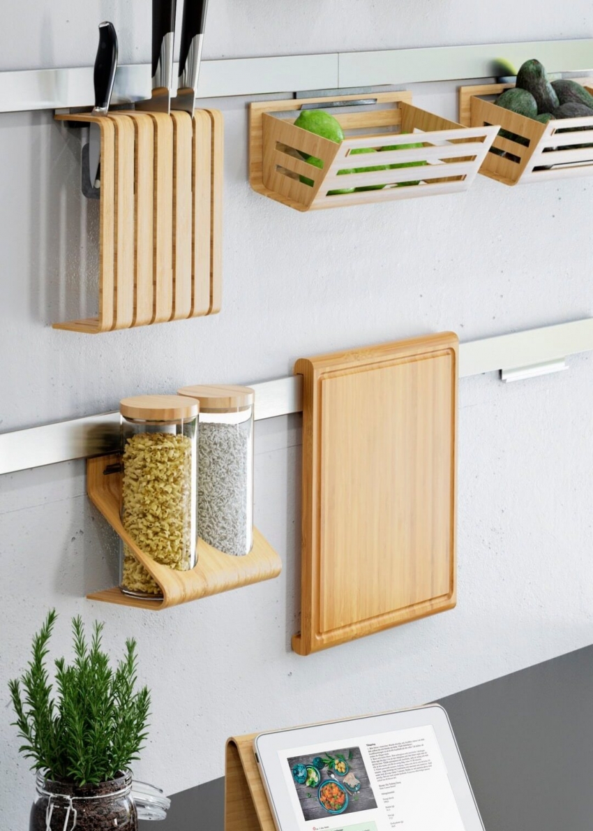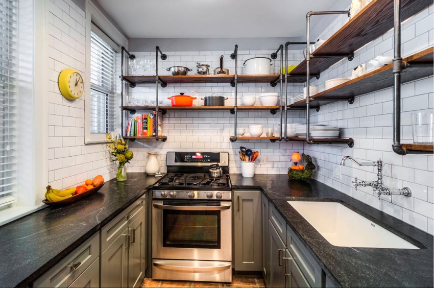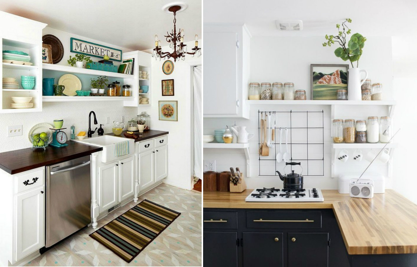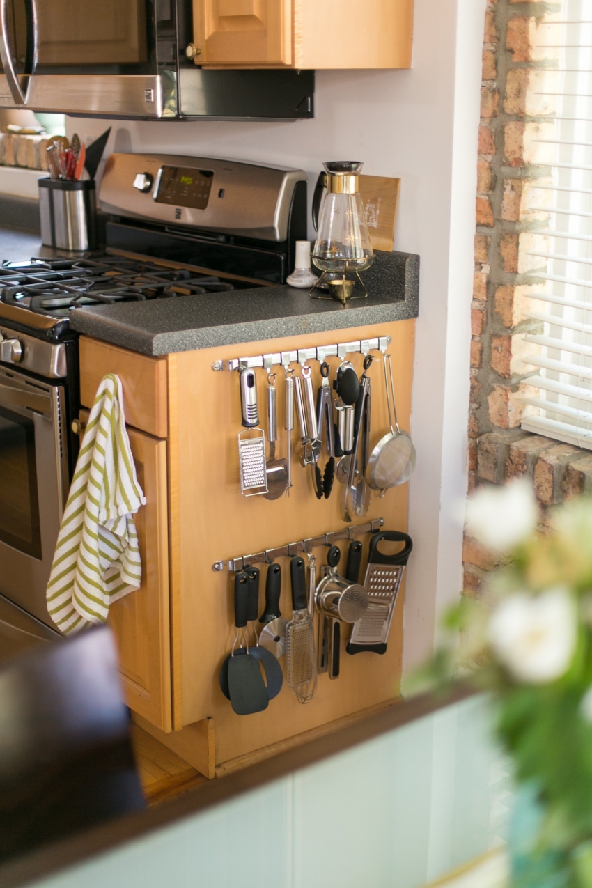 Không gian lưu trữ bổ sung trong nhà bếp nhỏ có thể được cung cấp bằng cách sử dụng nhiều loại kệ và móc