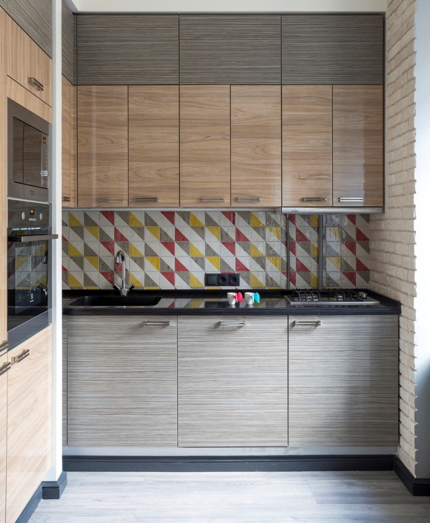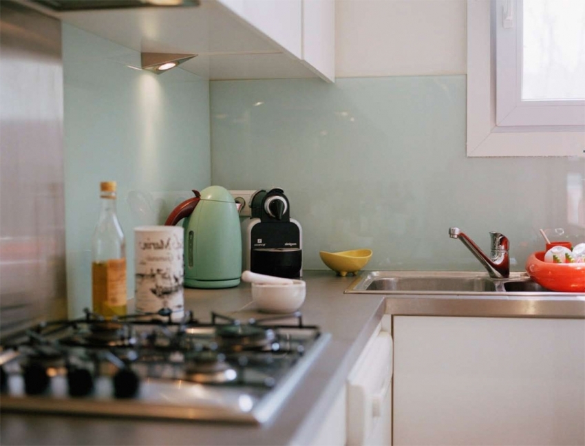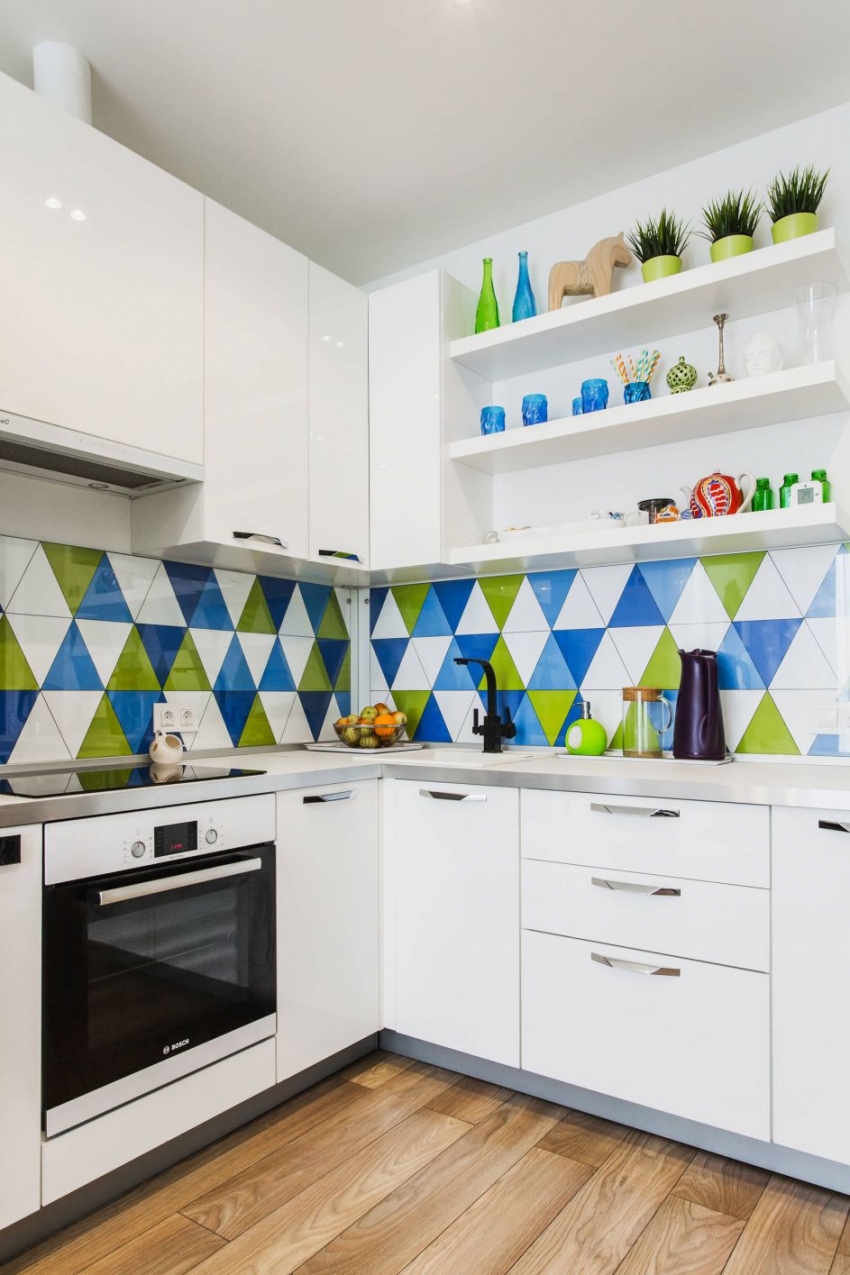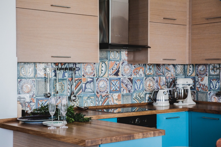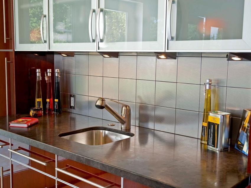 Tạp dề nhà bếp đáng được quan tâm đặc biệt, việc lựa chọn chất liệu thường gây tranh cãi. Các chuyên gia tin rằng tốt hơn là nên ưu tiên cho bề mặt bóng, vì như vậy ánh sáng sẽ được phản chiếu và căn phòng sẽ sáng hơn. Hiệu ứng này sẽ mở rộng nhà bếp một cách trực quan. Đối với việc lựa chọn màu sắc, điều mong muốn là tạp dề phù hợp với màu của mặt bàn hoặc tường nói chung.