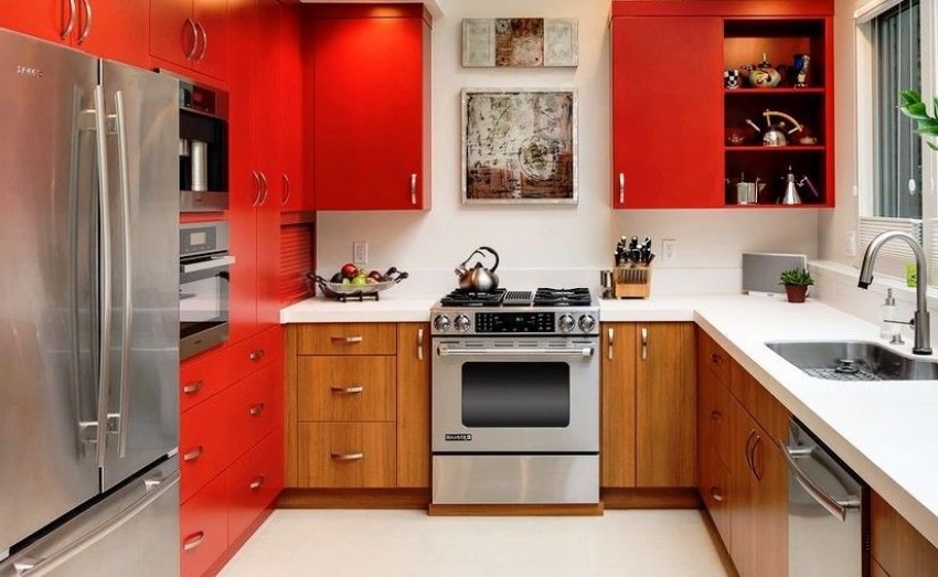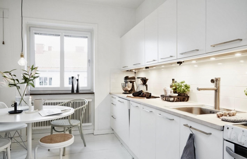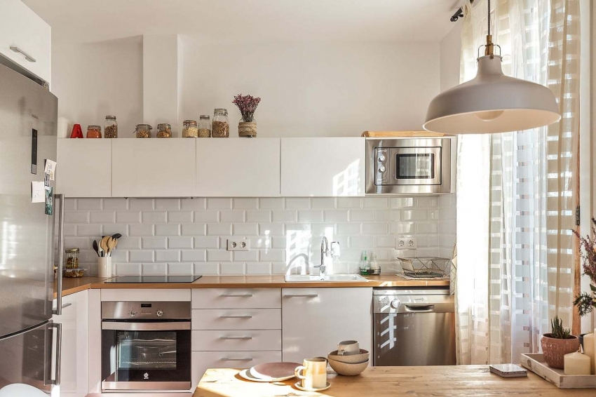 Quan trọng!Trong một căn bếp nhỏ, không nên để bừa bãi vào không gian bằng các đồ vật và phụ kiện. Tránh cất đồ sành sứ và đồ dùng bên ngoài tủ và tất cả các loại đồ trang trí không có chức năng để làm cho nhà bếp của bạn rộng rãi về mặt hình ảnh.